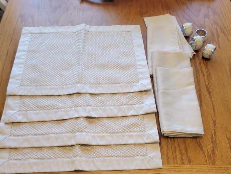 Never used just sat in closet Have 4 placemats, 4 napkins, 4 pearl rings Light beige color, very neutral Great for the holidays Cash only no apps