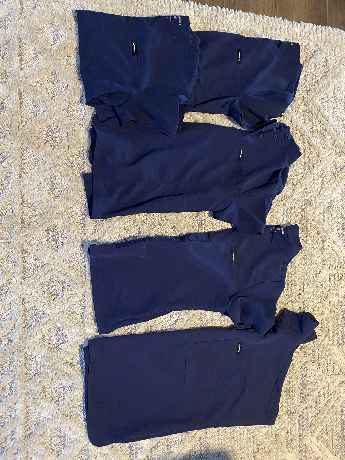 Jaanuu Scrubs Dark Blue 5 - medium tops 5 - medium petite pants 1 - small petite pant 1 - medium scrub jacket Bought and used minimally Comes from a clean household