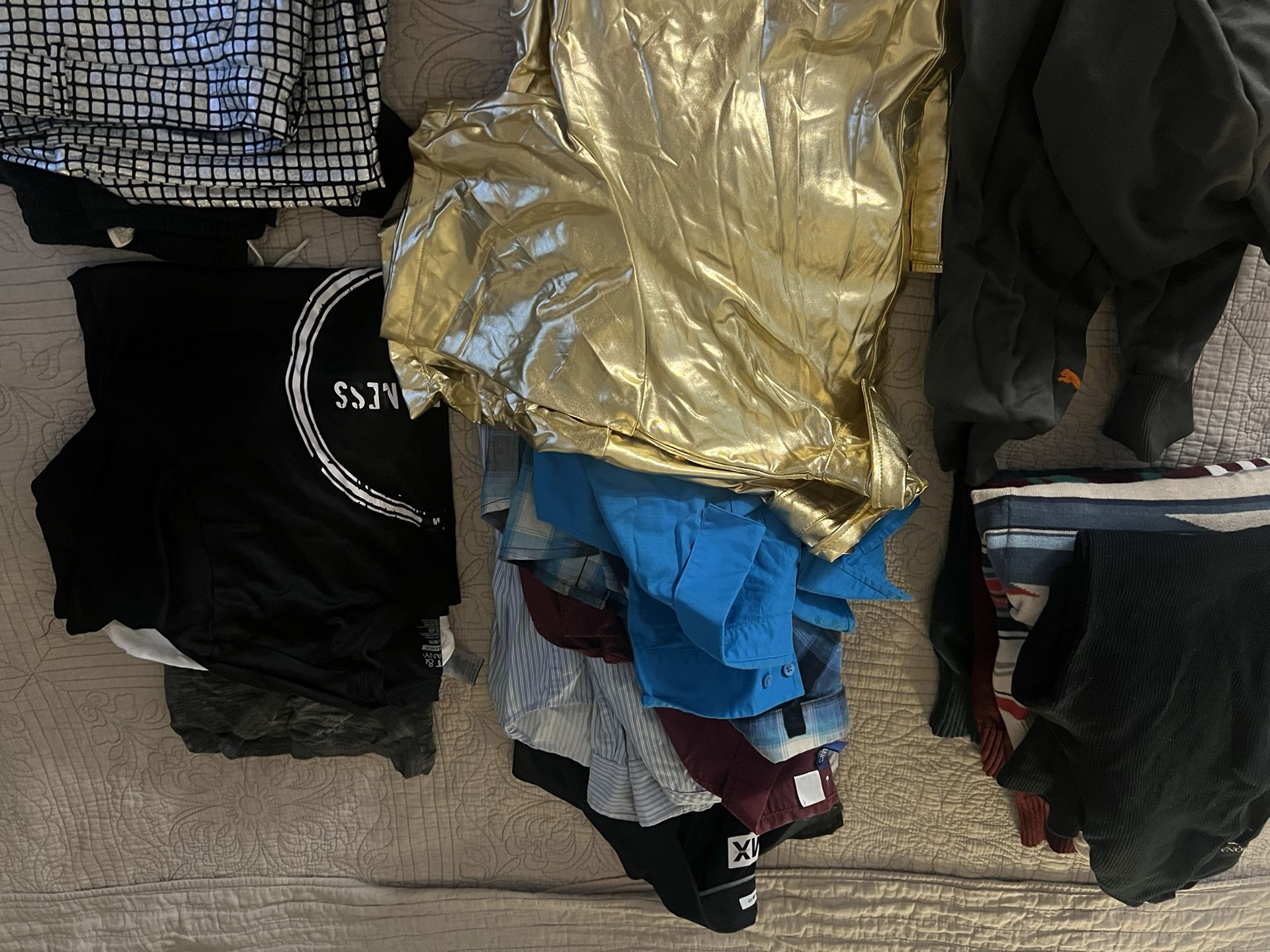 5 long sleeve button down shirts 3 sweaters ( 2 of them Xmas) 1 puma hoodie 1 long sleeve shirt 3 short sleeve shirts Disco gold short sleeve shirt and pants 15 pieces total Selling as a bundle