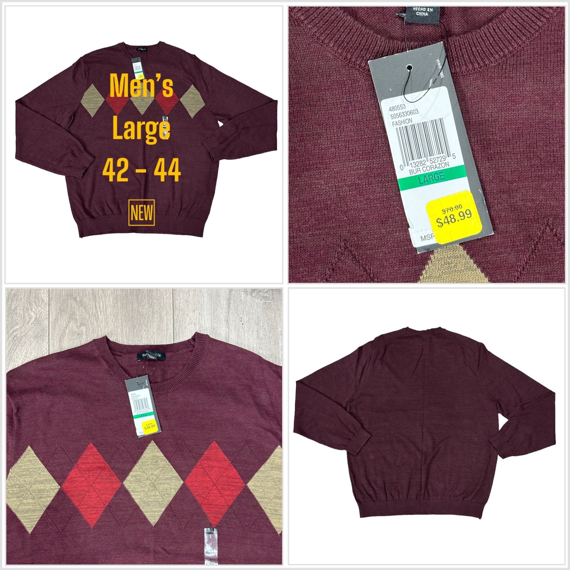 NWT New With Tags Retail Price $70 Men’s Van Heusen Golf Large 42 - 44 Crew Crewneck Argyle Sweater Pullover Long Sleeve Argyle Diamond pattern burgundy, maroon Red Tan Khaki warm Extremely Soft 100% Cotton Machine Wash Measures chest underarm to underarm 23” inch Length 28” inches 1223 bin 34 13oz