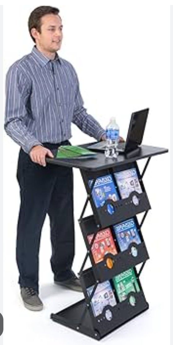 This is a black, foldable literature display rack with a tabletop.