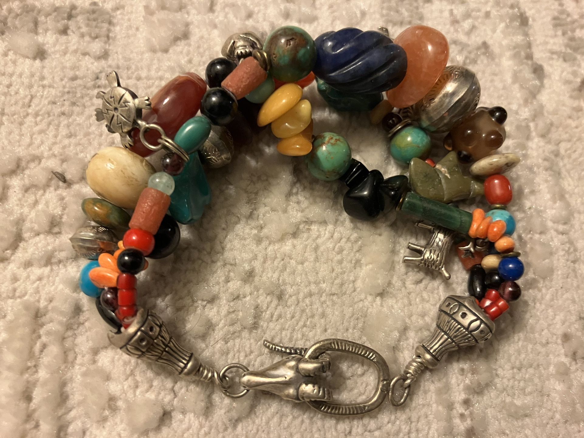 handmade multi-strand gemstone and sterling silver charm bracelet featuring Rams head clasp various semi-precious stones and charms including kokopelli, lizard, and turtle figures.