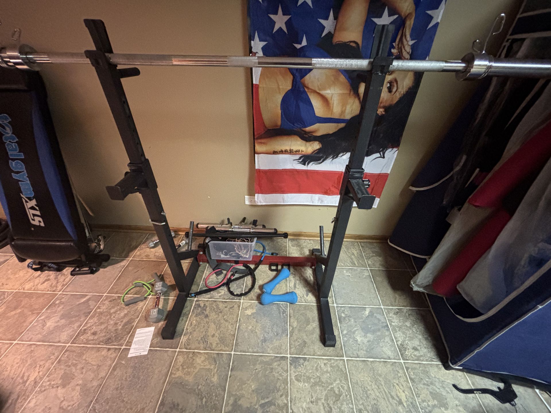 Weight plates (alone): $100 (sold) Barbel + clips: $150 (sold) Adjustable Curved + dumbbells: $25 (sold) Rack: &100 (sold) Bench: $75 (sold) Total gym: $150