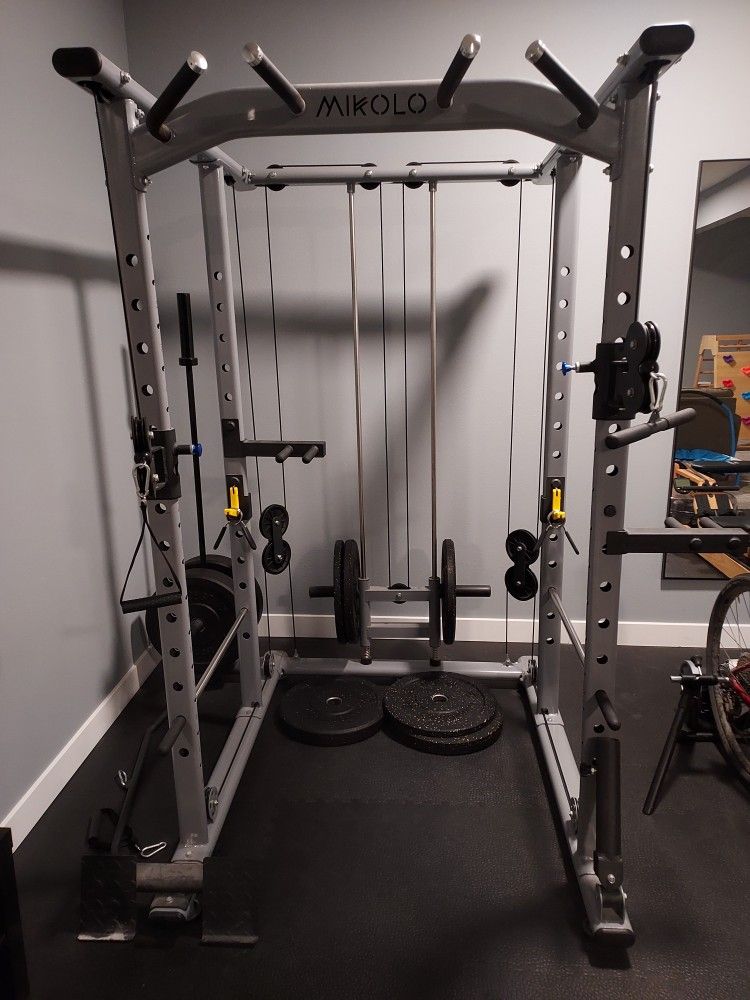 Weight lift rack with pulley system. Mutiple attachments and weights.