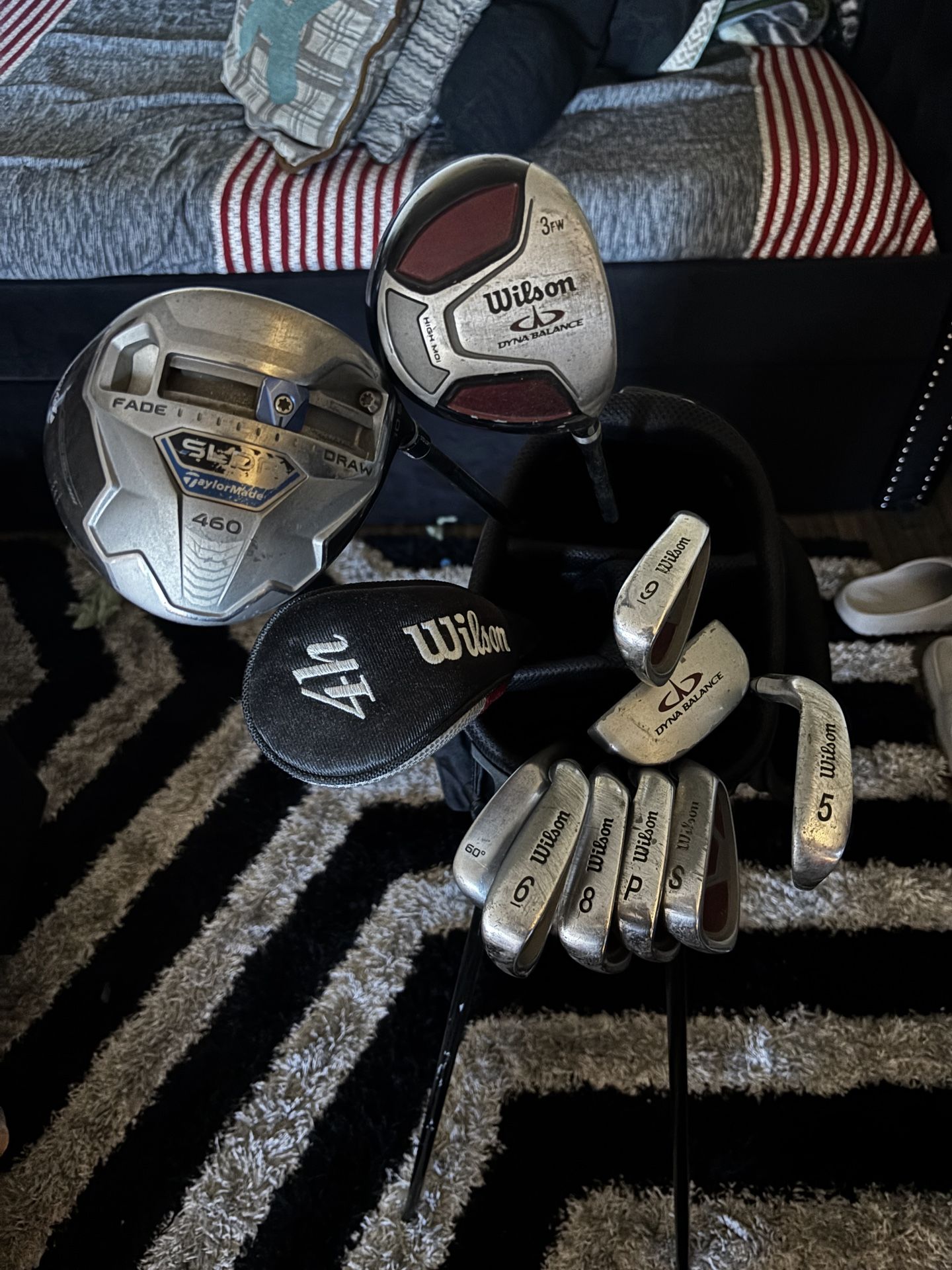 Selling Wilson right hand golf clubs just cause I haven’t used them in a long time they just sit and take up space. Will go as it comes. 3 rubber mat tees A bag full of tees 3 golf balls