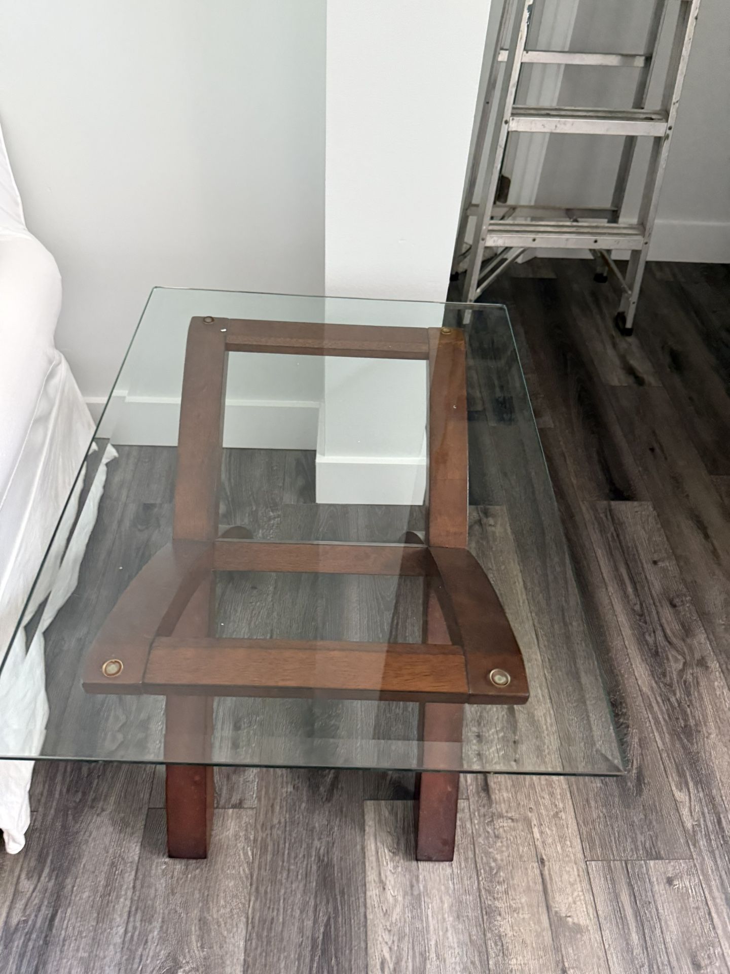 Two glass top and wood end tables $30 24”t 32”d 24”w Excellent condition Coffee table. Solid wood. Minor scuffs on top. $20 51”long 28” deep 32” wide