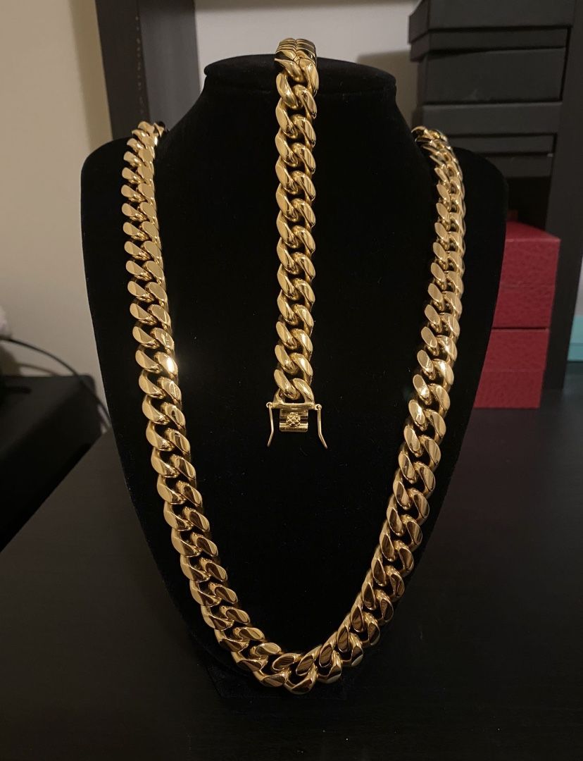 14k over stainless steel 14mm Necklace is 24” Bracelet 8.5” Brand new with box pick up in clearwater