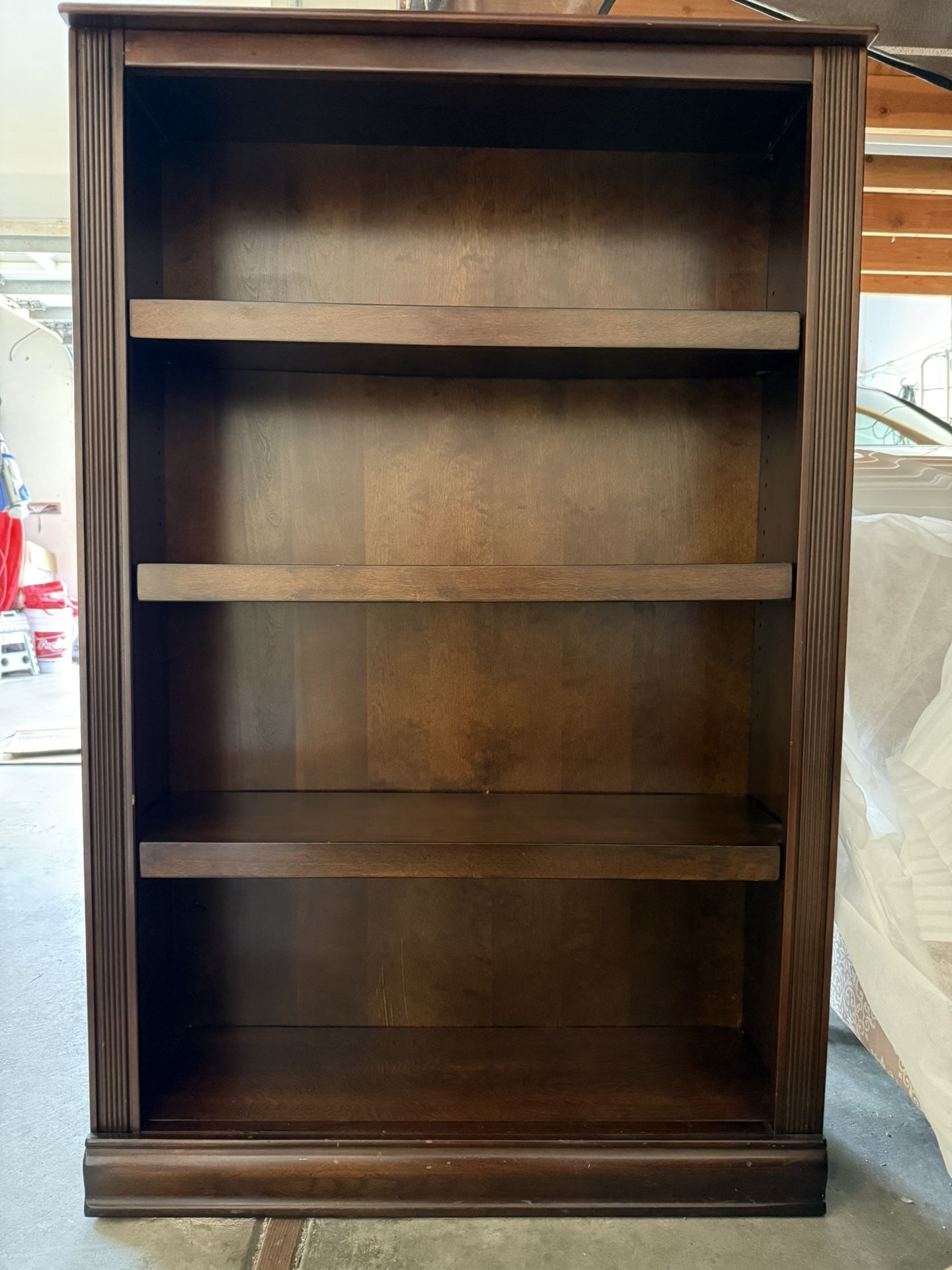 Solid wood bookcase with four shelves is in great condition. Measures 53” tall x 34” wide x 11” deep.