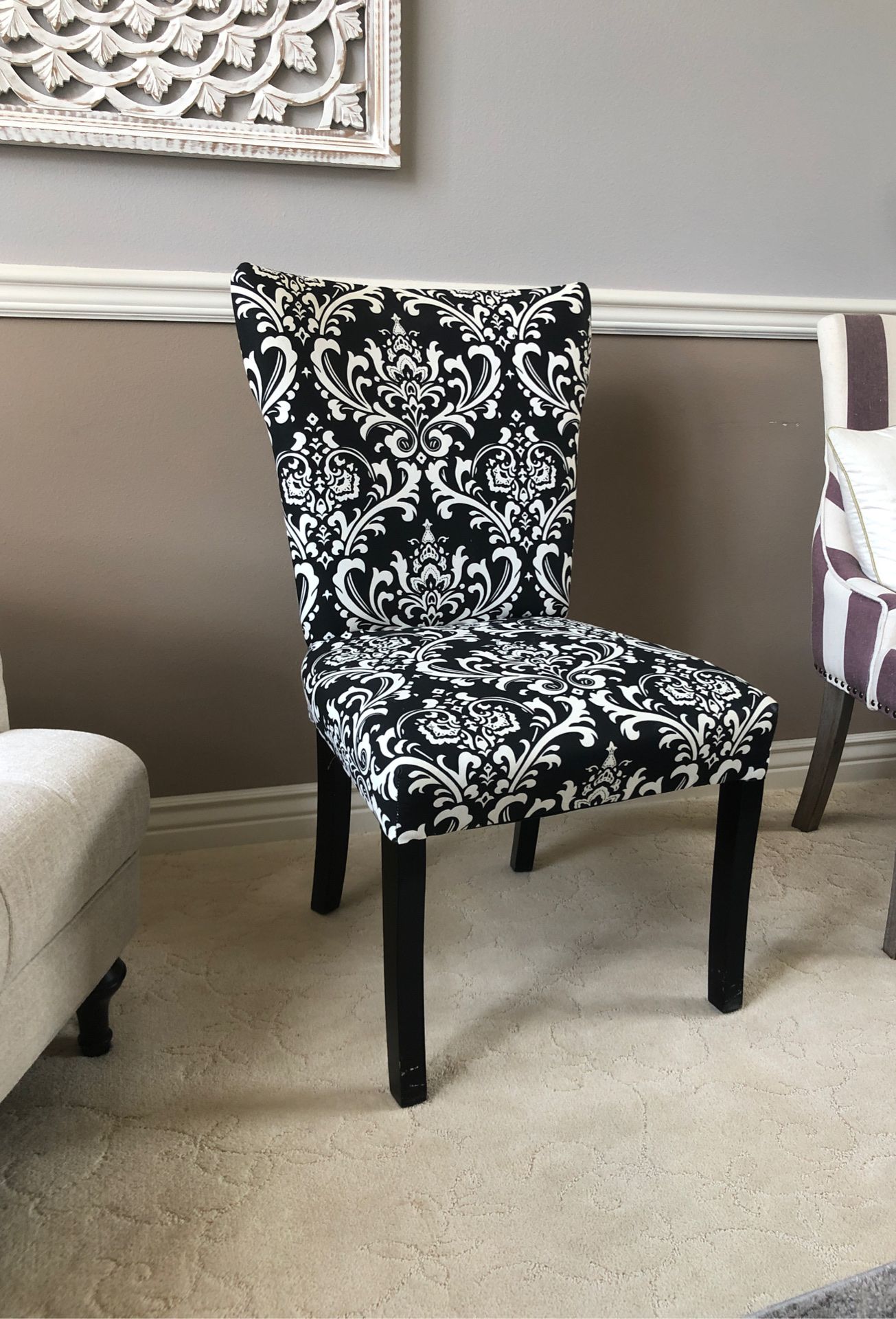 Great formal chair. Padded and very comfortable. And a very cool pattern. 20” to seat - 40” to back. No smokers, no pets.