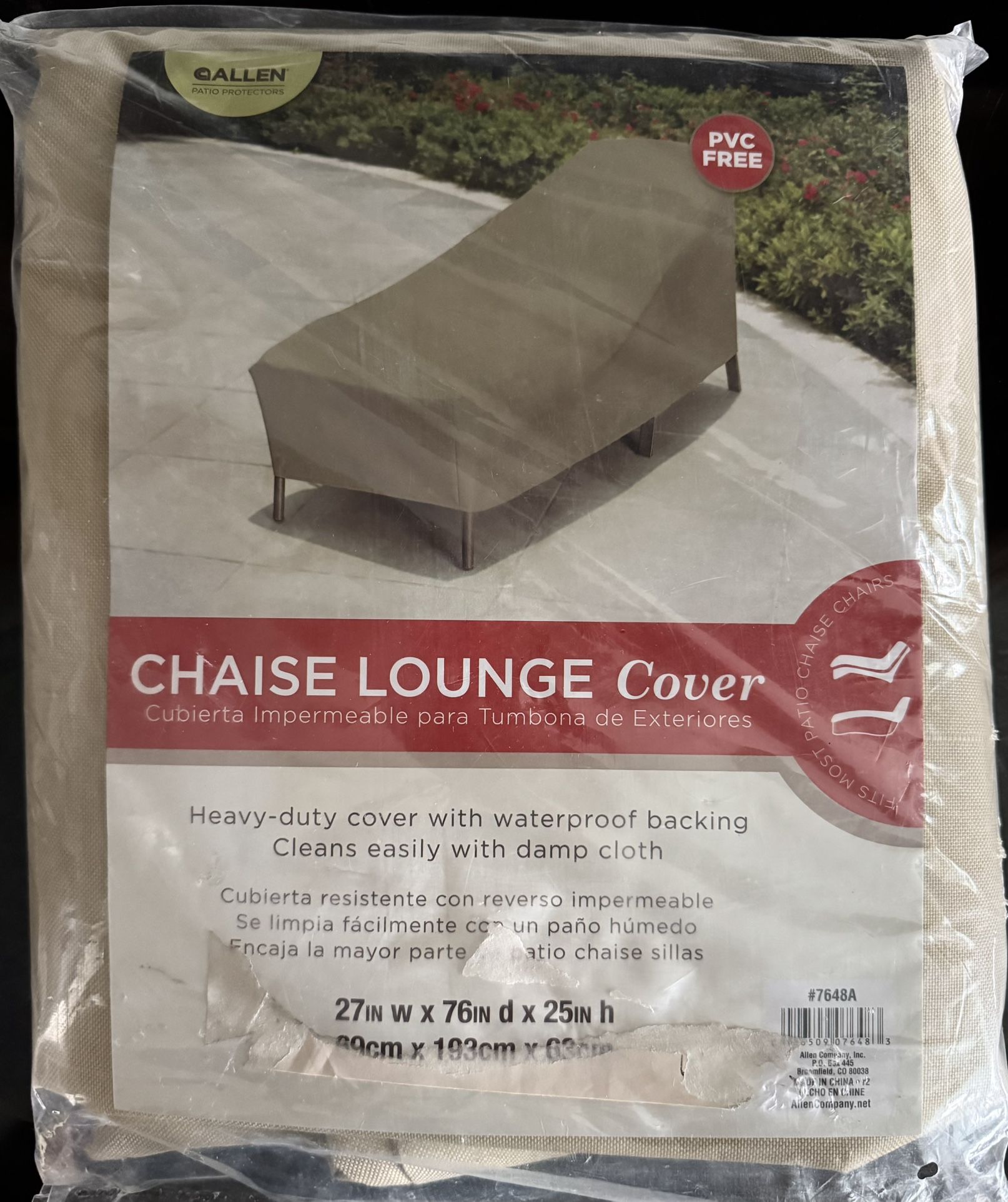 This is an unopened, beige chaise lounge cover by Allen. Heavy duty protection against the elements/various weather conditions. Waterproof backing PVC free Easily cleanable with a damp cloth Standard size 27” W x 76” D x 25” H Cash only! Public meet up is in S. Fort Myers at the Walgreens on the NE corner of US41 and College Parkway. Address is 12749 S. Cleveland Ave., Fort Myers, FL 33907