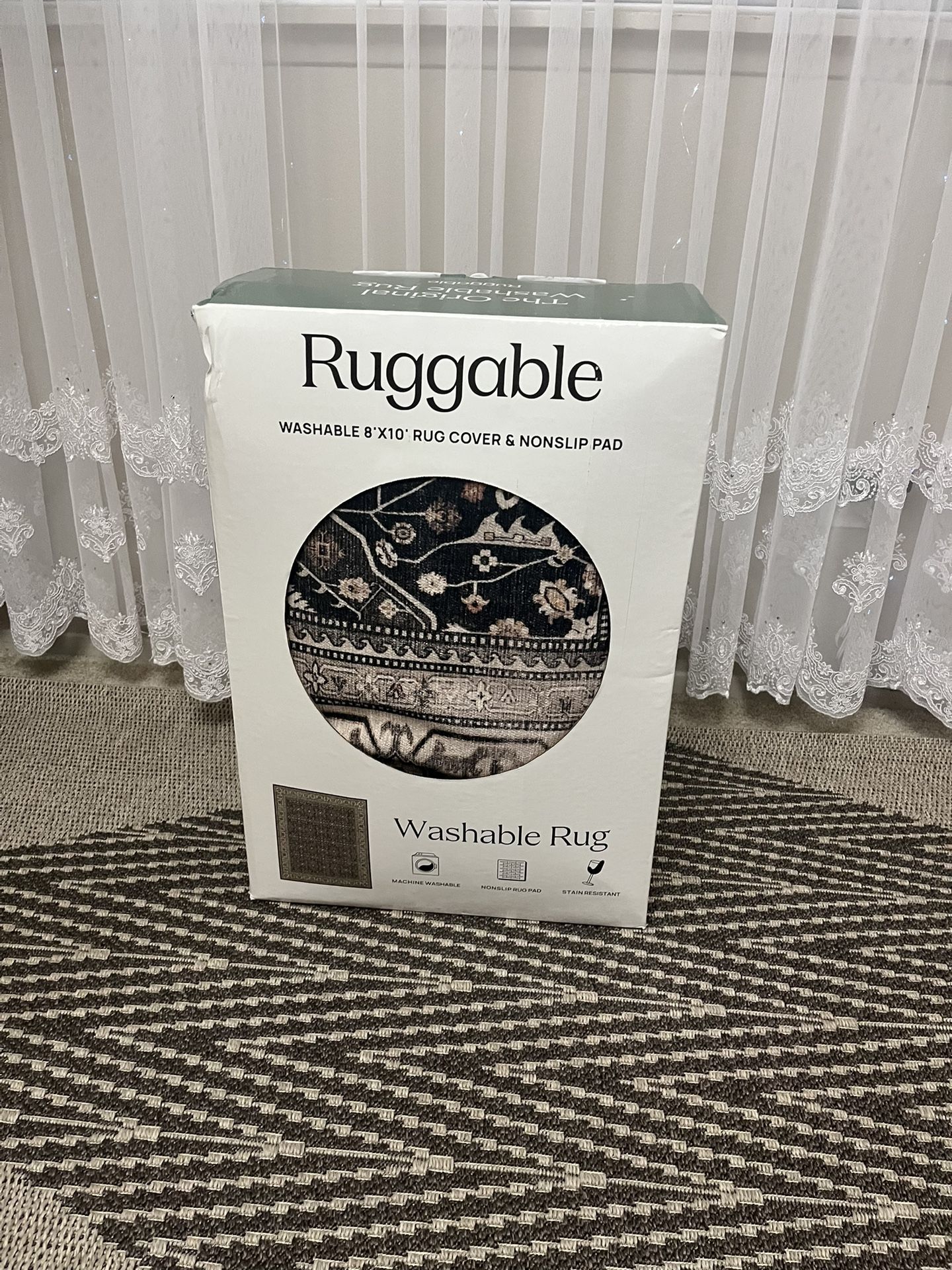 New in the box. Never unfolded. Retail $330 Size 8’ x 10’ Flatwoven 100% Polyester 1/16” thick rug cover Nonslip 1/8” rug pad Machine washable Patented two-piece system Stain-resistant Water-resistant Durable SKU 1941