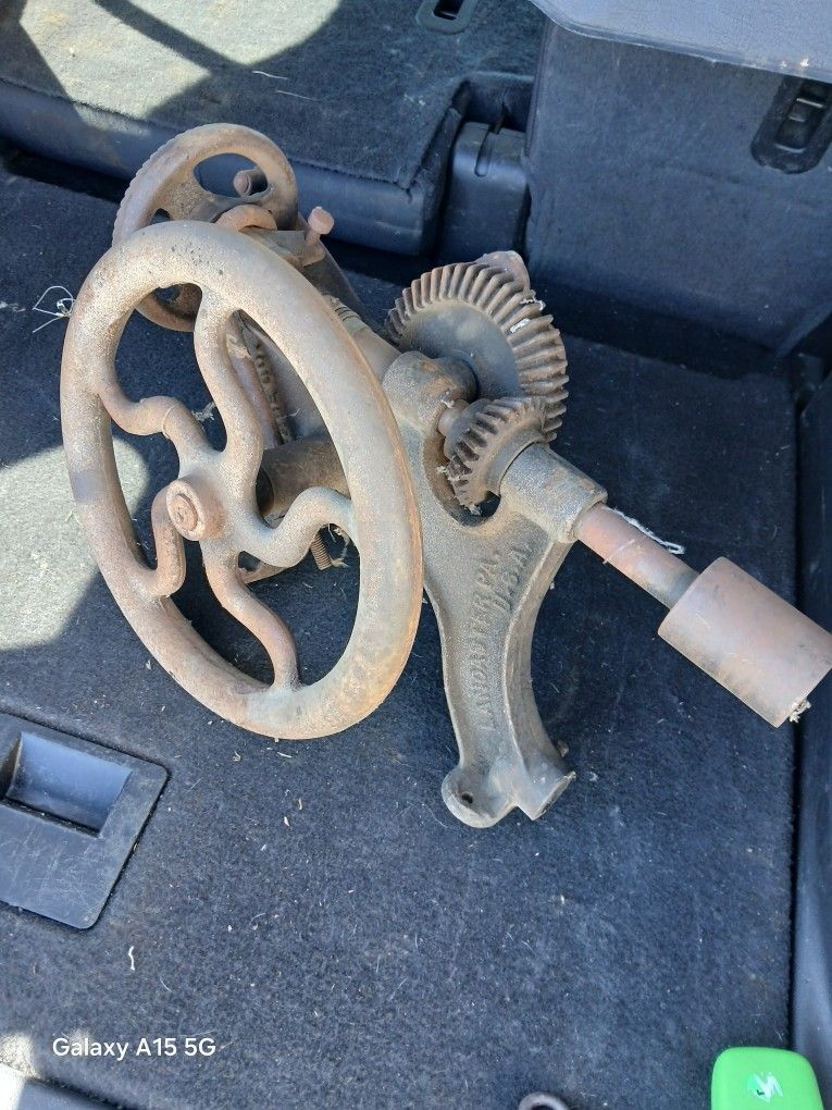Very old antique giant drill out of Lancaster Pennsylvania, late 1800s with alot of Cast Iron parts, giant wheel, asking $95.00