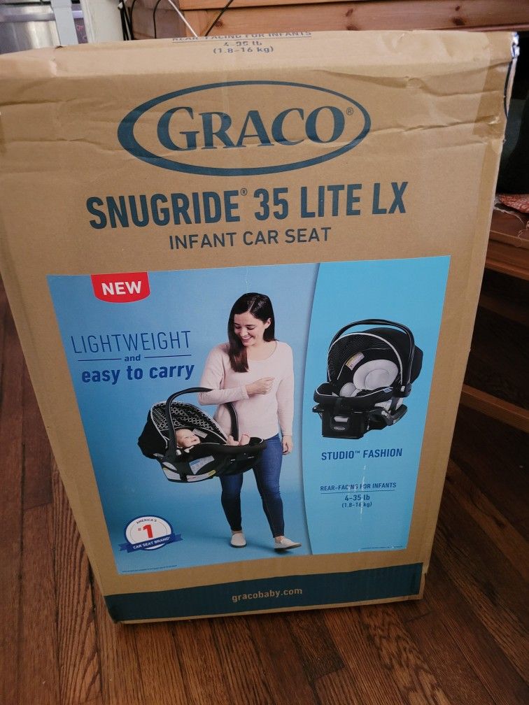 The Graco SnugRide 35 Lite LX is a lightweight (7.2 lb) rear-facing infant car seat designed for babies weighing 4–35 lb and up to 32 inches tall. It features a 4-position adjustable base, 2-piece head/body support, and Click Connect technology for easy attachment to Graco strollers. Brand new in unopened box. Retail $150