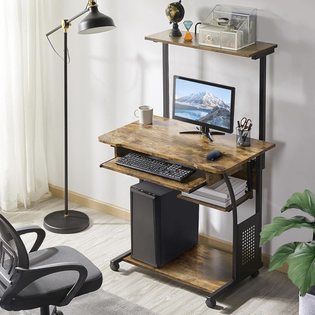 3 Tiers Rolling Computer Desk with Keyboard Tray and Printer Shelf for Home Office, Mobile Computer Desk for Small Space, Retro Computer Table Compact