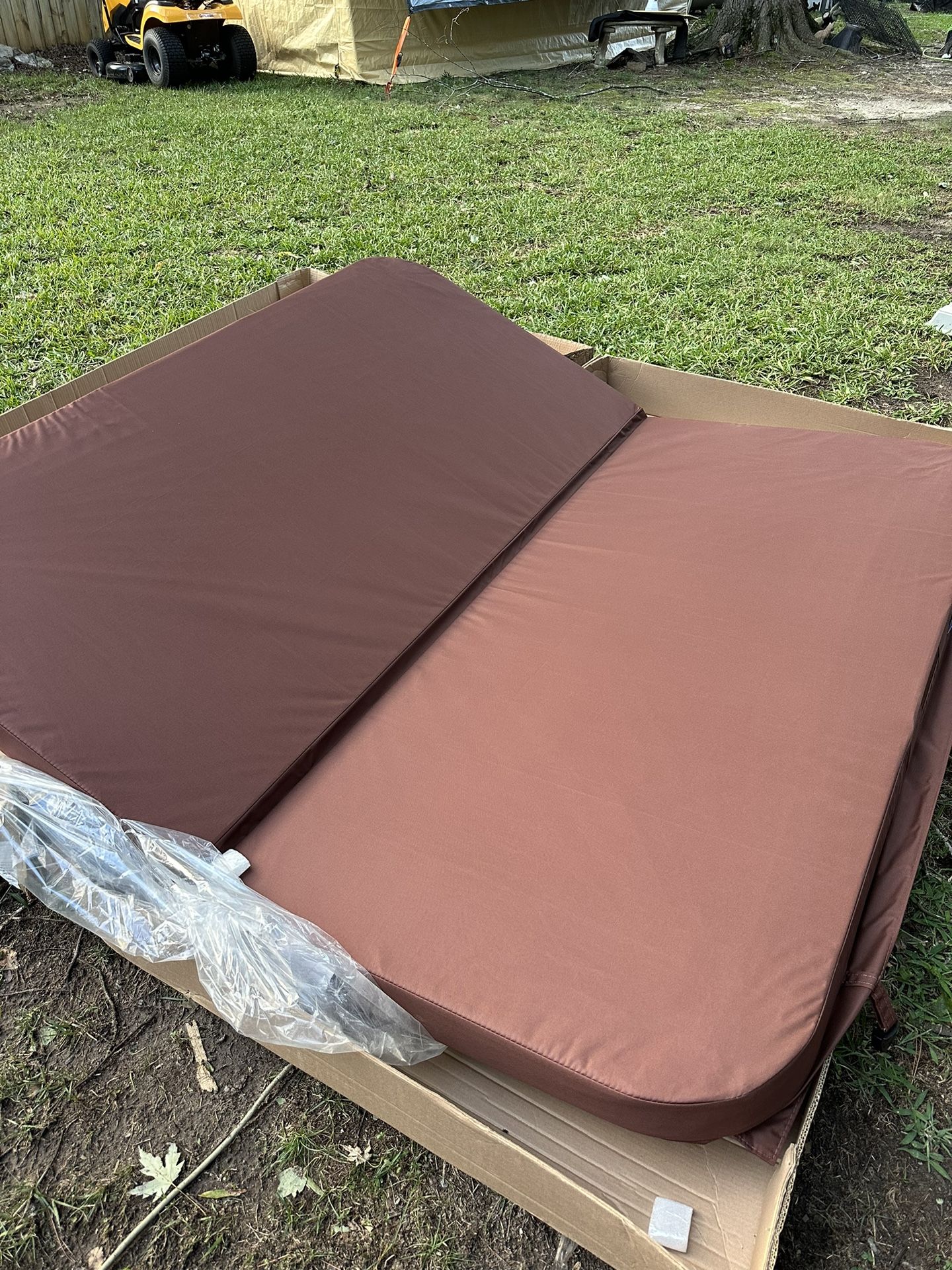 Brand new, in (very large)box, hard spa cover measuring 76”x76” with 8” radius corners. Has premium tapered fill that is 5” in center and 3.5” on the two sides allowing for excellent water runoff. Has skirting all the way around, 2 stitched handles, 4 locking hasps (comes with the 4 hasp receivers that mount on or around spa and the 4 hasp clips stitched onto both sides of the cover. The key to childproof the clips is also included). Was $700 new so this is a steal.