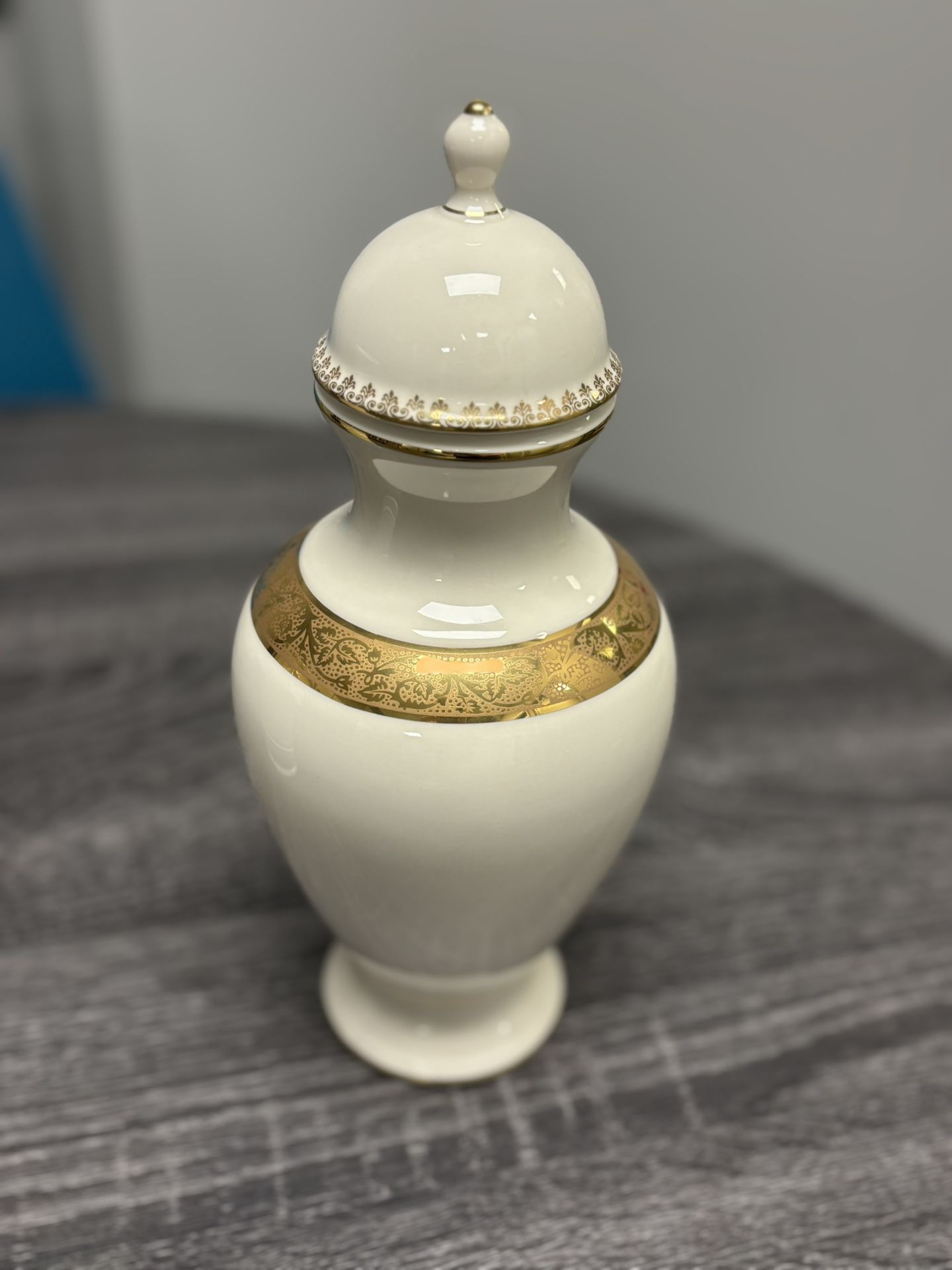 Vintage Ethan Allen Urn Vase, White with Gold Trim Brand: Ethan Allen Colors: White and Gold Condition: Excellent, like new Measurements: * Approximately 8" without top on * Approximately 11" WITH top on
