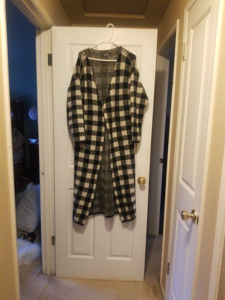 This is a plad women's duster to wear over slacks and a sweater or shirt it is a sweater material comes long down to the ankles and is extremely warm I've only worn once in the winter time so not usually would like to give to someone that could use it it keeps you very warm you can wear anywhere and it's like a nice warm coat come get I'm not using