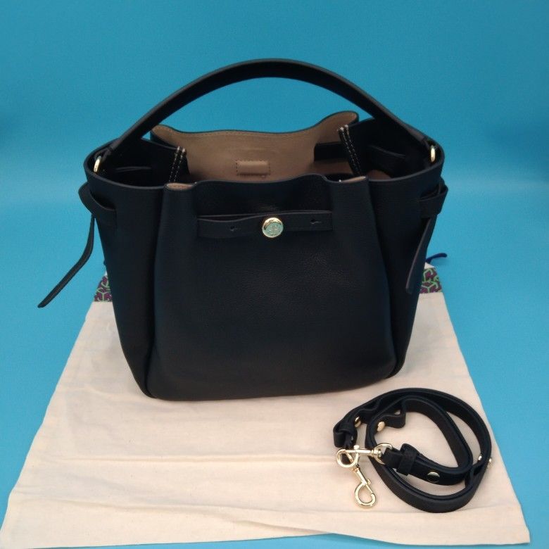 Brand new with tags,unused. Height: 8.5" (21.5cm); length: 8.7" (22cm); depth: 3.7" (9.5cm) Pebbled leather Magnetic snap closure; belted strap with collar stud closure Top handle with 5.3" (13.5cm) drop; adjustable, removable shoulder strap with 13" (33cm) drop; extends up to 21.7" (55cm) drop 1 interior slit pocket Dust bag included Size small.