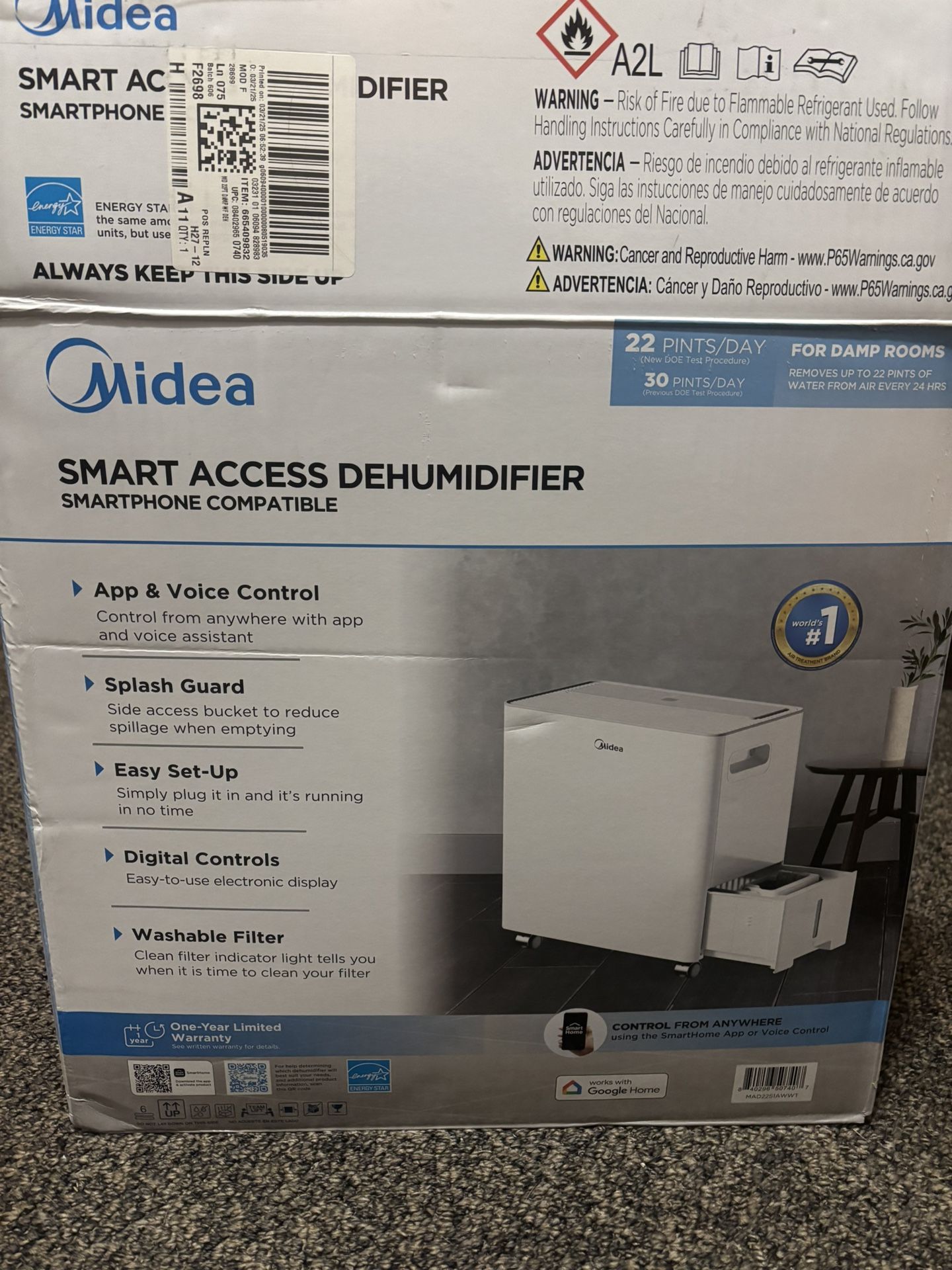 Midea smart access Dehumidifier 22 pint. Still in the box... Original price $194 before tax looking to get $50 so I can get it gone quickly OR BEST OFFER