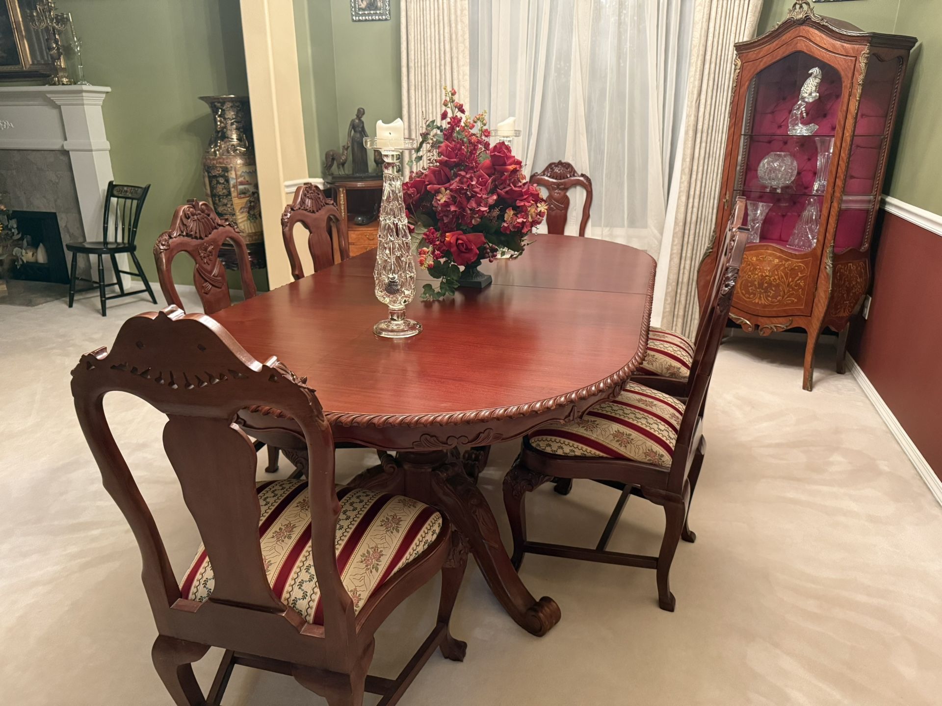 Iβm selling this beautiful dining set on behalf of my parents, who have taken exceptional care of it. Itβs a stunning Queen Anne / Chippendale Revival style dining set crafted from solid wood with a rich mahogany finish β truly a statement piece that adds timeless elegance to any home. π Dimensions: 48β W x 88β L x 30β, extends to 104β with a 16β leaf πͺ Includes: 6 intricately carved chairs with upholstered seats This set features graceful cabriole legs, claw-and-ball feet, and detailed hand-carved edging, all showcasing classic craftsmanship. The upholstered seats are in excellent condition, and the overall piece reflects both quality and care. β¨ Highlights: β’ Solid mahogany construction with hand-carved detailing β’ Queen Anne / Chippendale Revival design β’ Extends easily with 16β removable leaf β’ Elegant striped upholstery in excellent condition β’ From a smoke-free, pet-free home π Location: Bethany area (NW Portland) π Pickup only This heirloom-quality dining set has been beautifully maintained and deserves a home that will appreciate its timeless charm and sophistication.