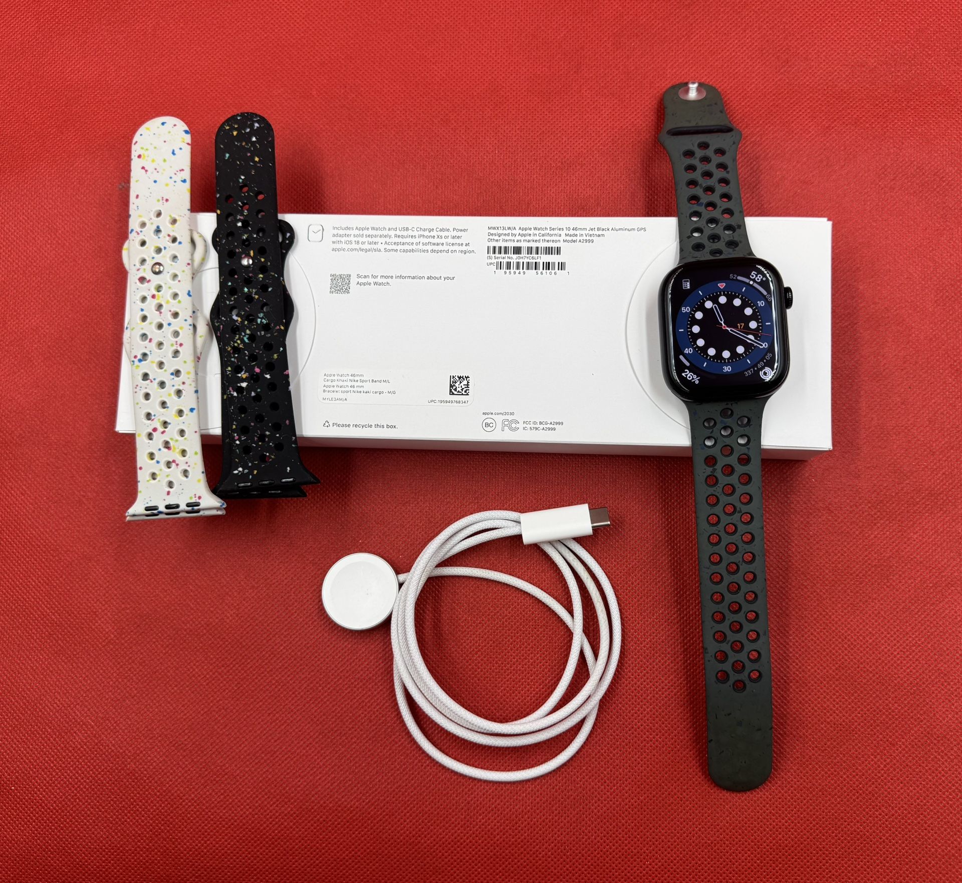 FIRM Price! Has AppleCare+ Warranty till June 13! NEW replacement from Apple under Warranty, and I upgraded to an Apple Watch Ultra, so selling this. I never have used this replacement from Apple, only set it up to take photos and show it has 100% Battery health/capacity! + 2 Bonus extra Watch bands as pictured + Bonus protective case for this Watch (NOT pictured) Apple Watch Series 10, GPS 46mm size, Black color Nike Sport Band in Green (with blue accents) AppleCare+ Warranty til June 13, 2026! Sale includes: Apple Watch Series 10 w/ 100% Battery + Warranty Original Box Original Charging Cable/Cradle (you will need a USB-C charger or port to charge it with, not included) Nike Sport Loop/Band, plus 2 BONUS extra bands Apple Watch case protector (not pictured) Apple Care+ Warranty AWESOME Price, Apple is charging $319 + tax for a refurbished one (and it doesn't include all the extras mine does) Pickup only Thanks