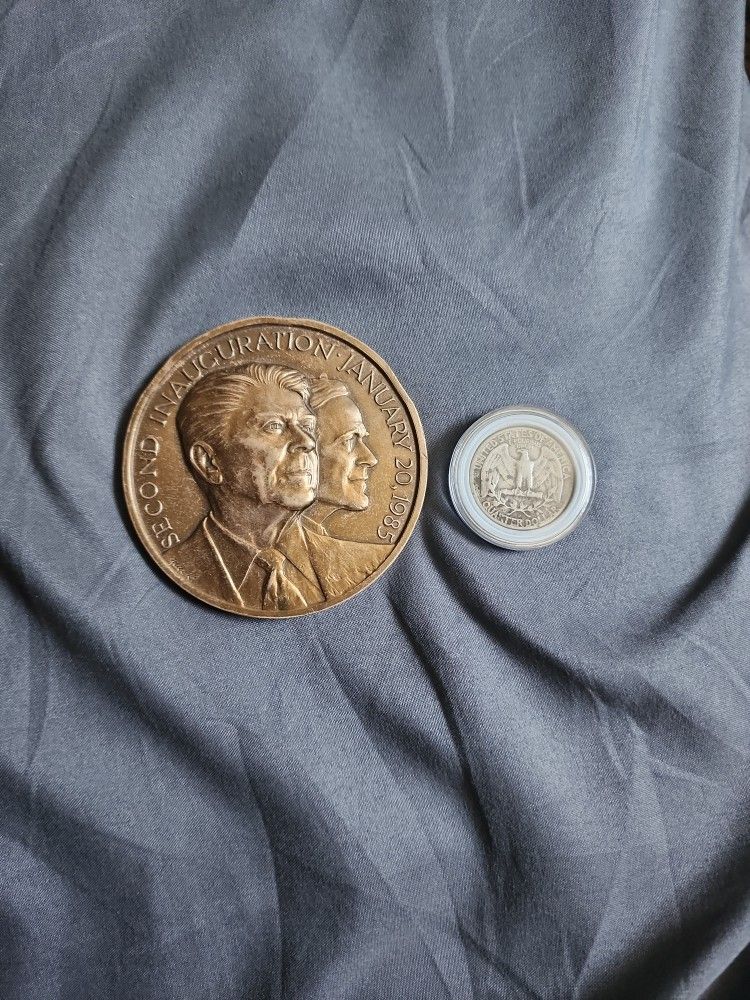 Tossed the quarter in for scale size. Part of American history RONALD REAGAN GEORGE BUSH 2nd Inaugural BRONZE MEDAL 1985