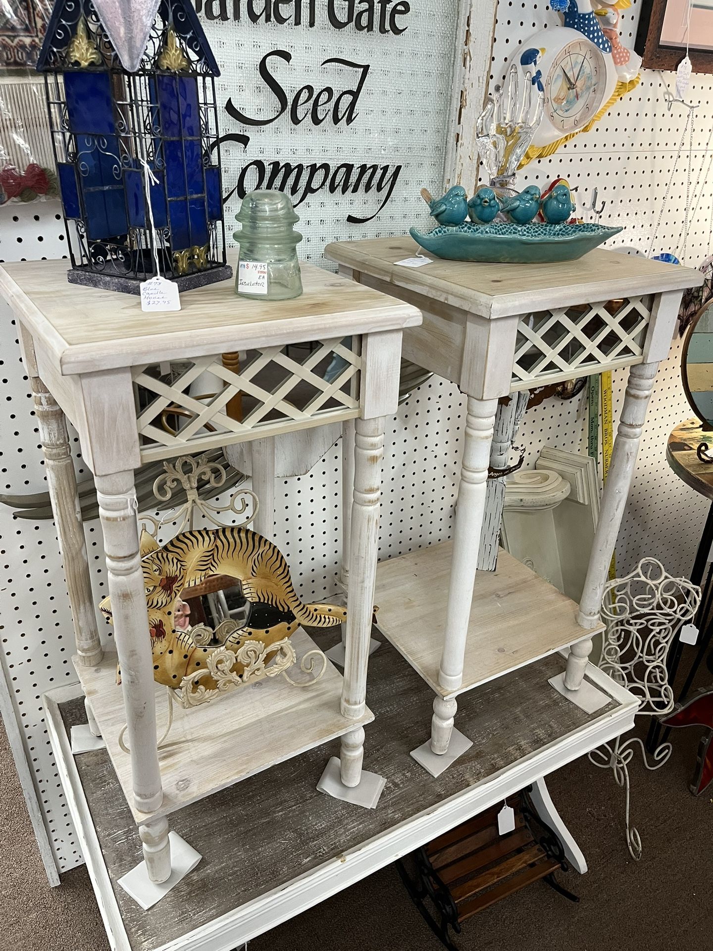 Set of 2 white washed small end tables. This can be found in booth C17. See photos for location and other info. Measures about: 14” wide, 14” deep, and 28” tall