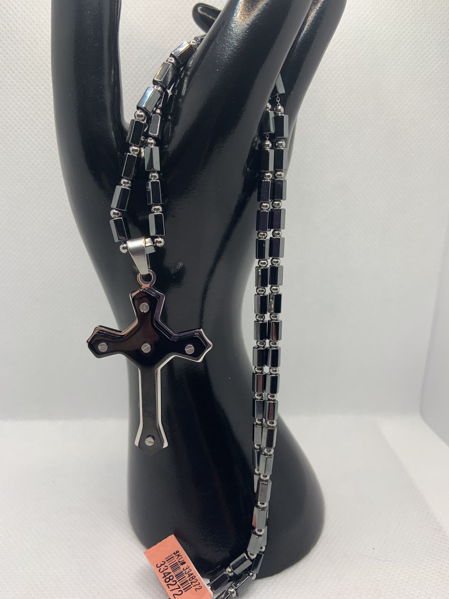 HÉMATITE CROSS PENDANT ON TUBE AND BEAD NECKLACE IN STAINLESS STEEL 110.00cts