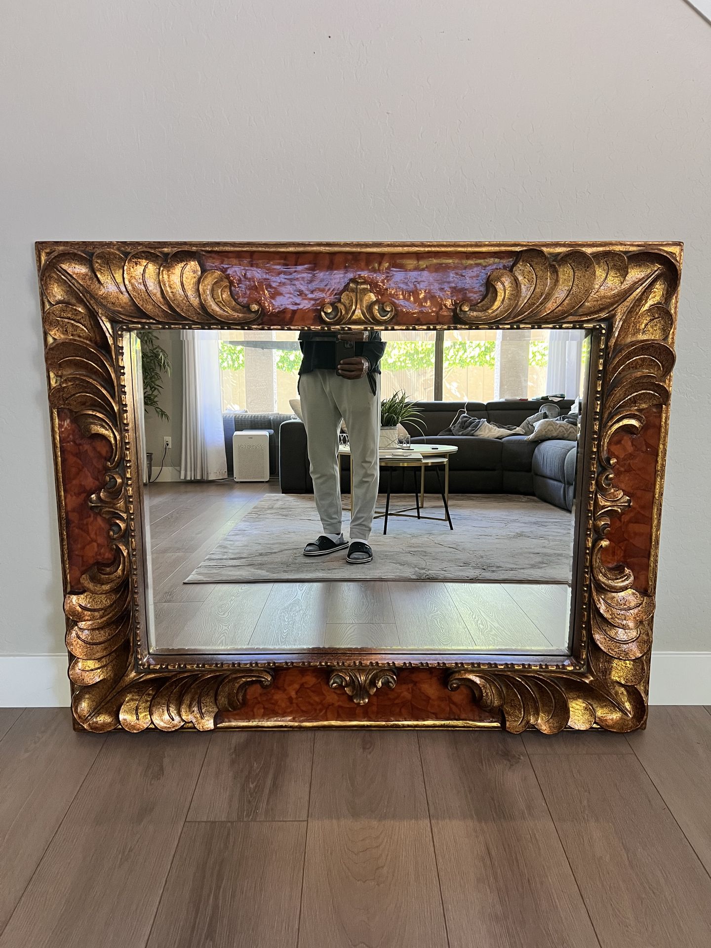 54x44” EXTRA Large Ornate Gold Framed Beveled Glass French Wall Mirror- Vintage Mirror- Large rectangle mirror, Large French mirror, Large Ornate Mirror, Victorian mirror, vanity mirror, bathroom mirror, wall decor! It is framed in what appears to be wood. Has a gold tone as well as some burgundy throughout. The design is so unique! This mirror is massive! And heavy! So stunning! This mirror can be placed in your bedroom or bathroom vanity mirror, or living room, or hallway. Replaced the original mirror to a new crisp beveled glass mirrors few years ago. That’s why the backing looks the way it does. Super sturdy, crisp, clean and In perfect condition! 54 width, 44 height, 3.5 depth Georgian style ornate mirror. Ornate Frame Glass French Wall Mirror, Large French mirror, Large Ornate Mirror, Rectangular mirror, Victorian mirror, Vintage mirror, antique wall mirror, vanity mirror, bathroom mirror, antique mirror. I’m selling multiple household items, furniture, artwork and home decor. Check out my other listings! The more you buy, the more you save!!