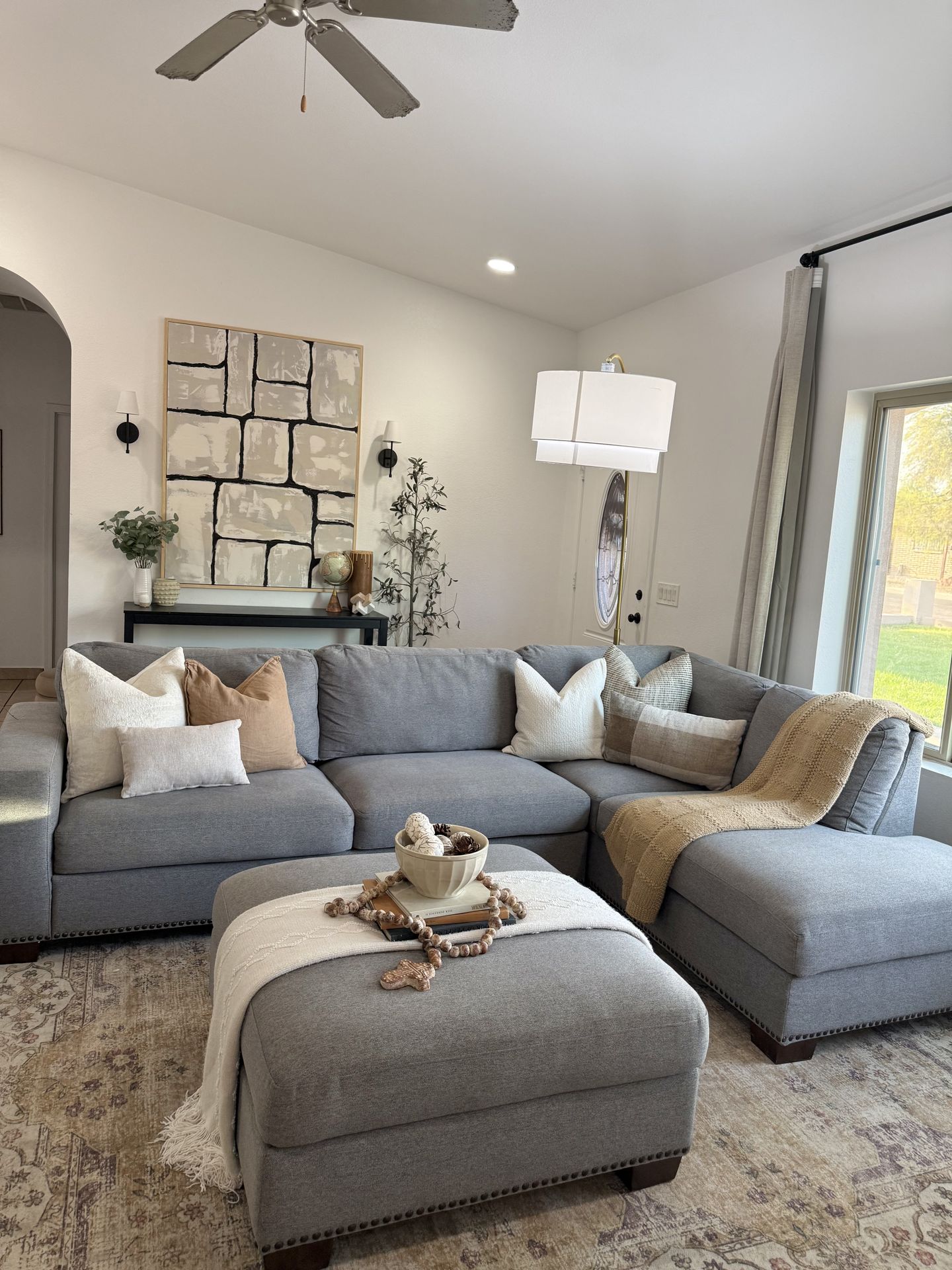 Grey comfy sectional sofa looking for a new home ! Great condition! No rips or stains. Comes with the matching ottoman. Free Delivery!!