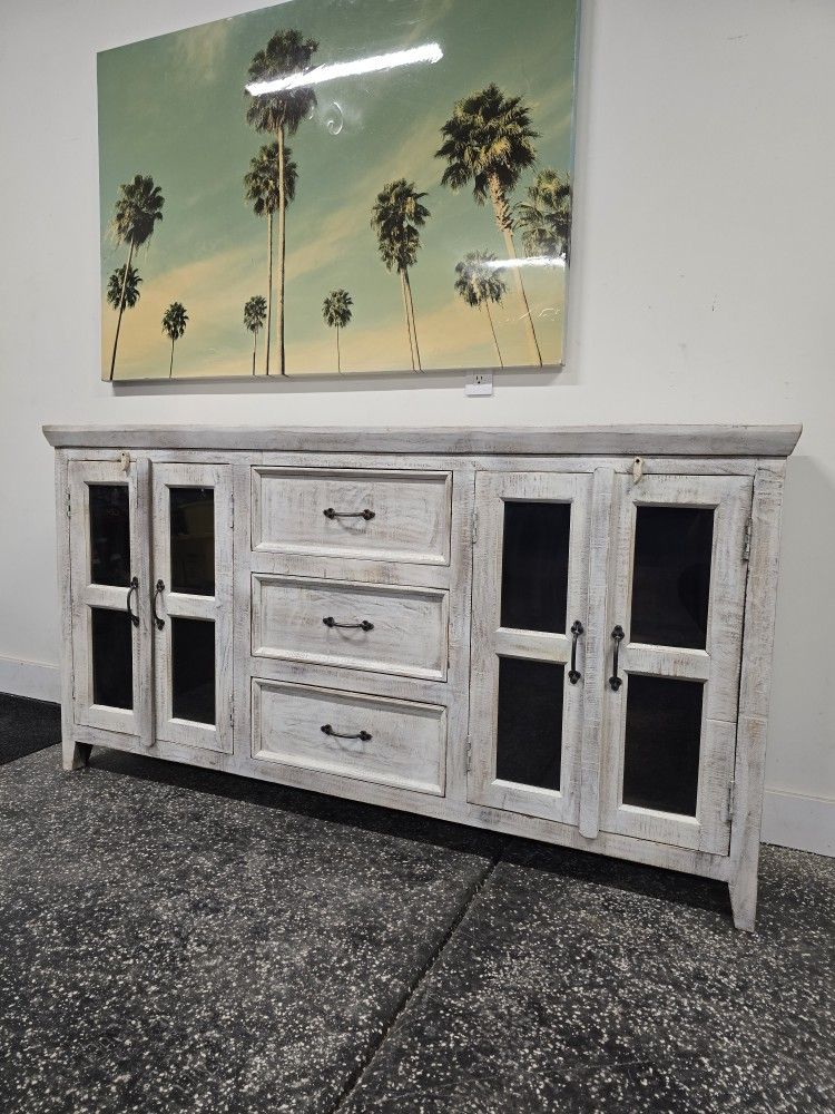 Rustic with distress farm style look. (Shabby chic) Great use as credenza buffet sideboard tv media stand hutch cabinet server sofa decor Entryway Cansole table Hallway Bedroom Restoration hardware Solid and heavy 70x14x36