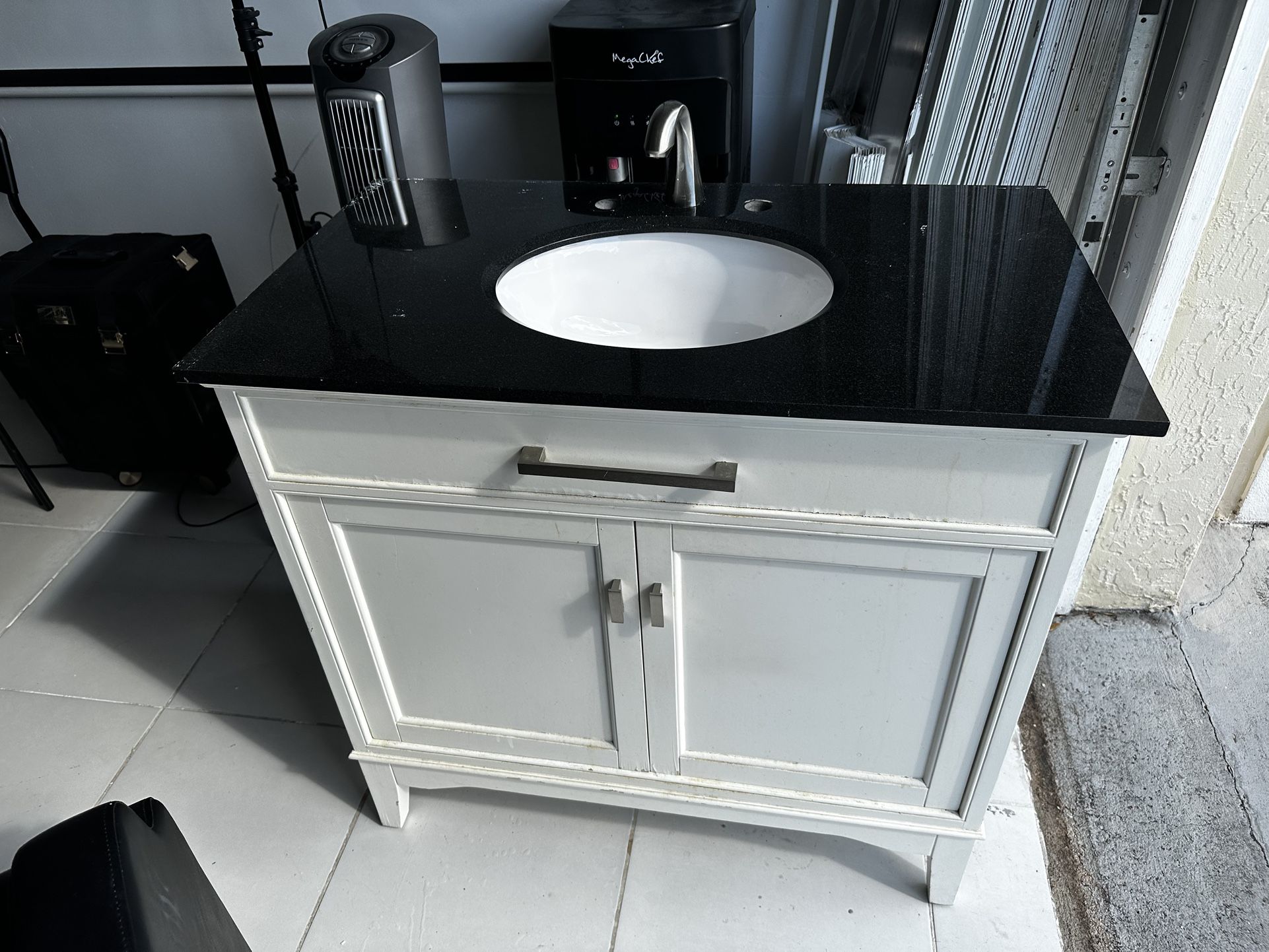 Faucet included Width 36 inch Height (in.) 35 Basin length 21 inch Some minor wear and tear on right side as seen in picture