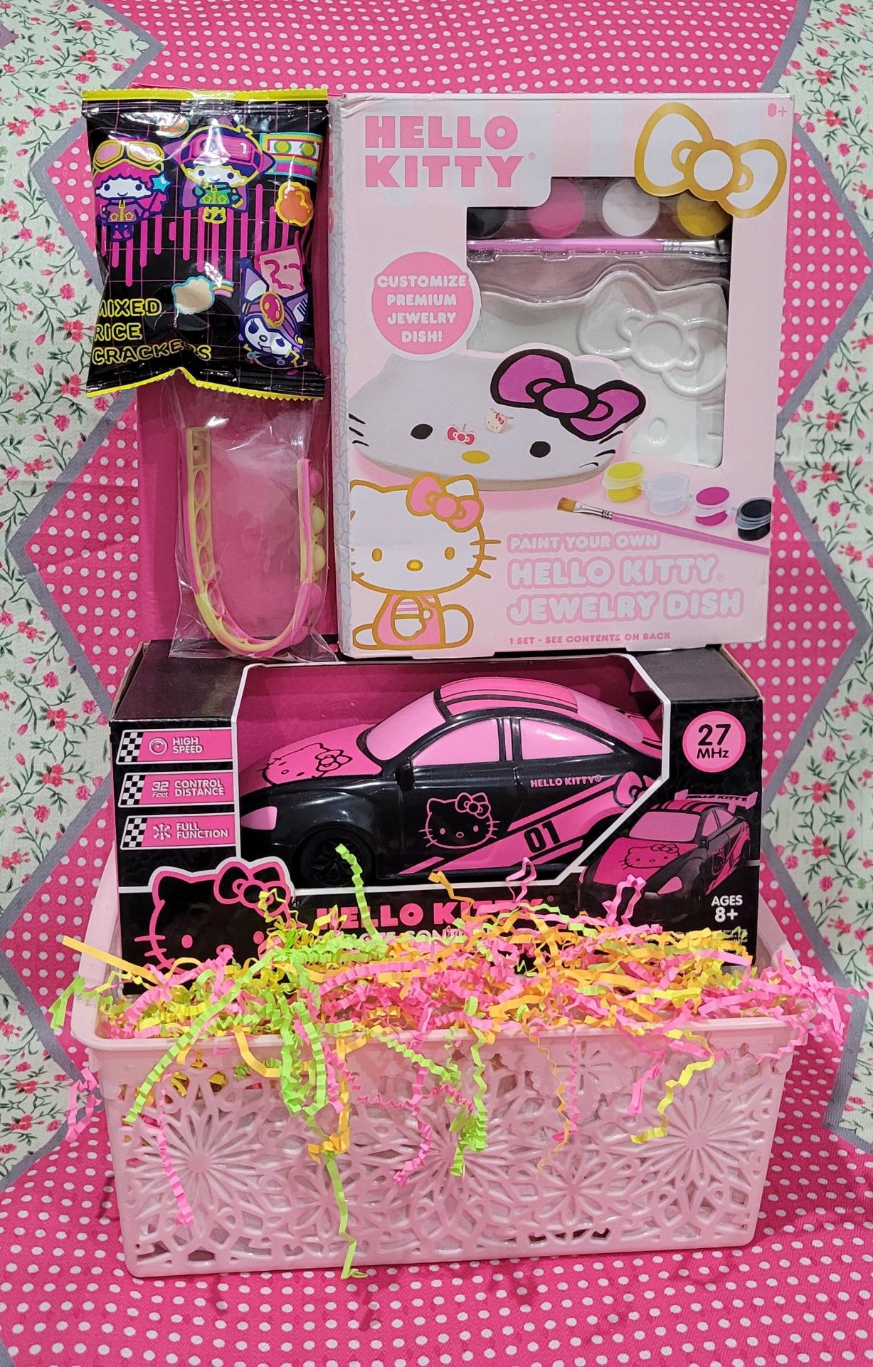 Cute Girls Gift Basket Happy Birthday π or Special Occasion Included Beautiful Pink Basket, Hello Kitty Remote Control Car, Hello Kitty Customize Jewelry Dish, Pop It Bracelet, and Sour patch goodies. Will Be Wrapped in Cellophane Wrap with Beautiful Bow! Thank you π Happy Birthday, Girls Gift Basket Special Occasion