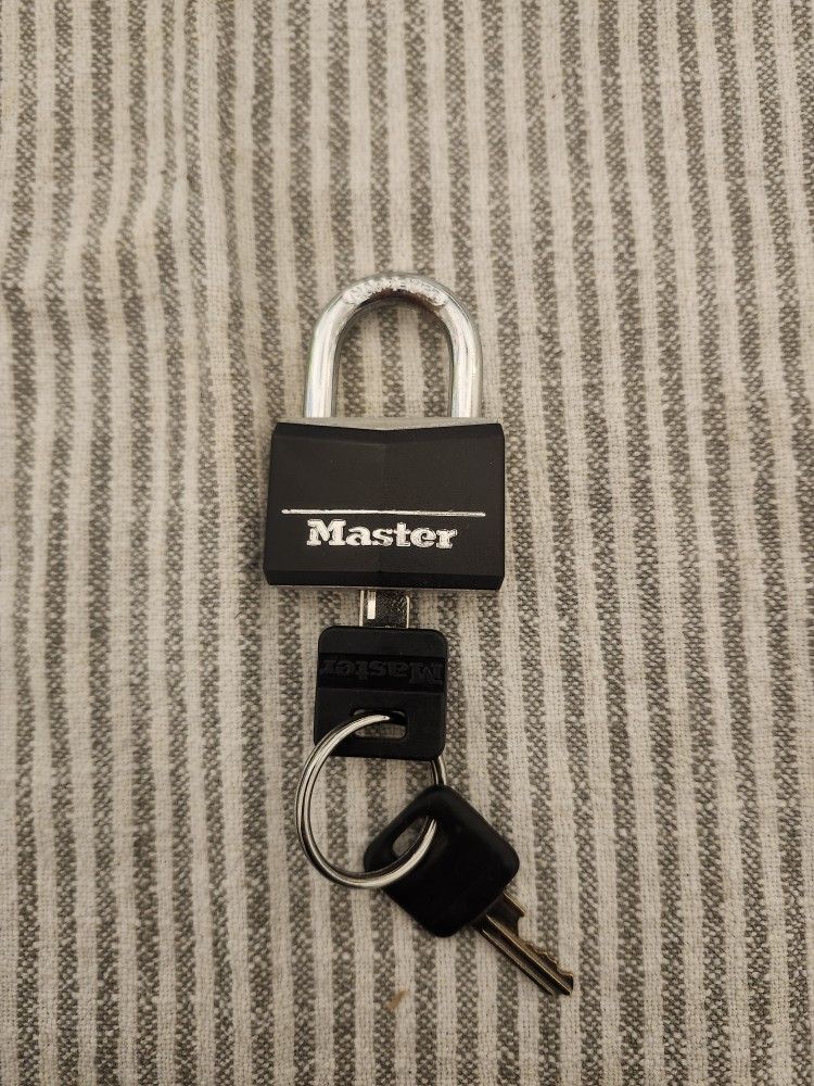 Selling a black Master Lock keyed padlock in great working order. This is the 141 series model, featuring a vinyl-covered body to prevent scratching and a hardened steel shackle for cut resistance. Includes: 1 Padlock and 2 Matching Keys. Features: Weather-resistant cover, 4-pin cylinder (pick resistant), and dual locking levers. Best for: Gym lockers, school lockers, storage units, toolboxes, or gates. Condition: Used but works perfectly. Smooth locking mechanism.