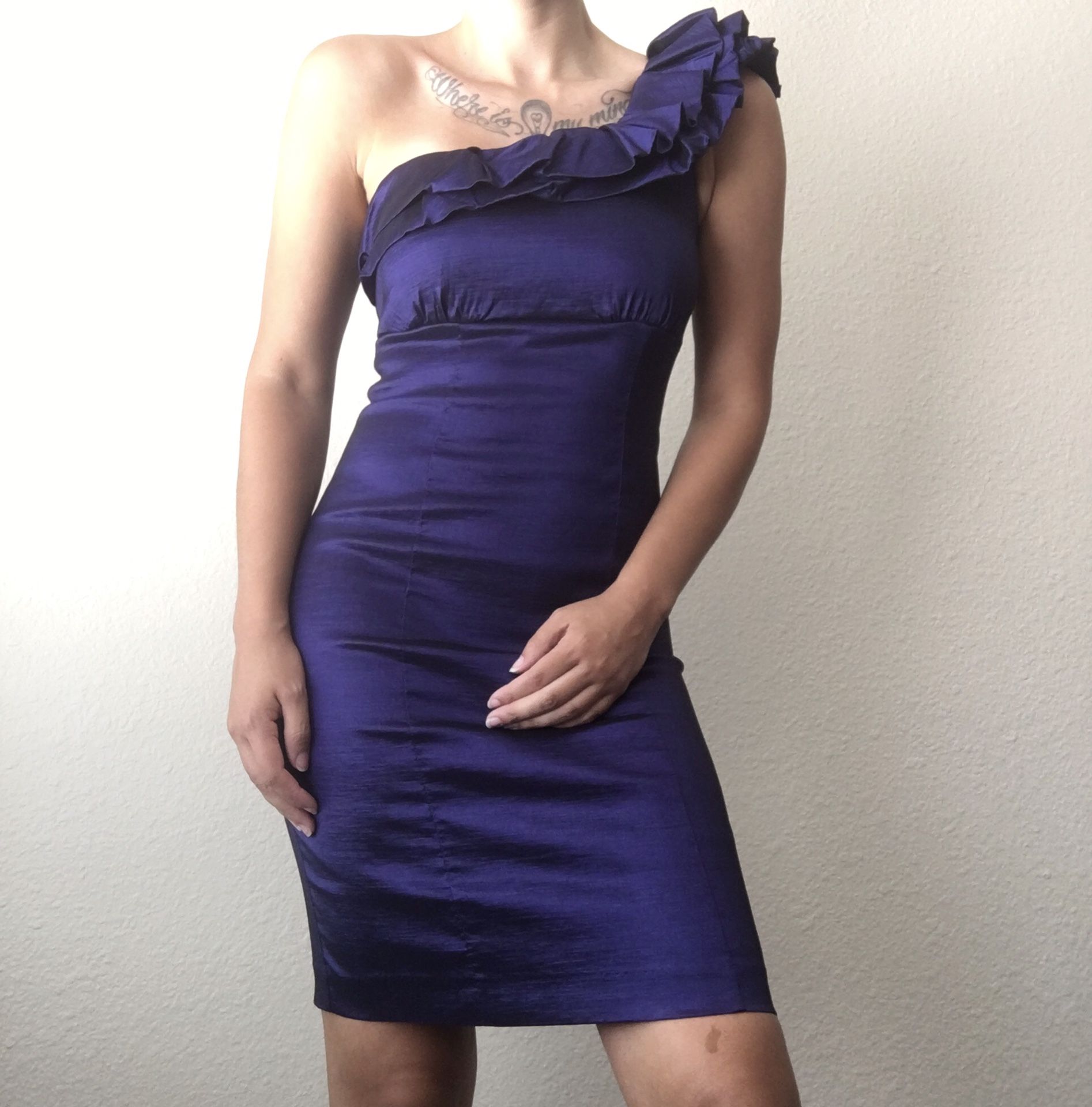 Size 7 metallic royal purple Snap dress with ruffle detail on shoulder. Dress: 60% Polyester 32% Nylon 8% Spandex / Lining: 100% Polyester Worn only once! My measurements for comparison: 5β4β/ 120lbs Bust: 34in / Waist: 28in / Hip: 38in Pick Up is also available! Check out my many other gems! π