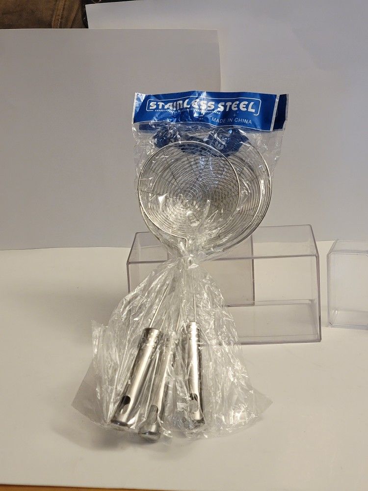 Stainless steel spider strainer/skimmer label style for cooking, new in package, they are hard to measure but it is approximately 14"×6" Please see pictures for best description and condition I do not ship or deliver Cash only please
