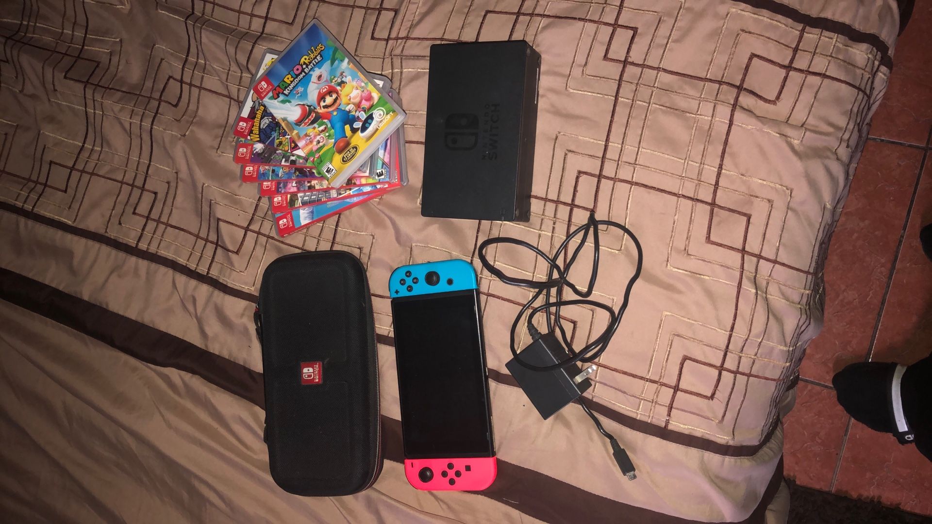 Comes with Dock + charger, a case, and 7 games Controllers are new