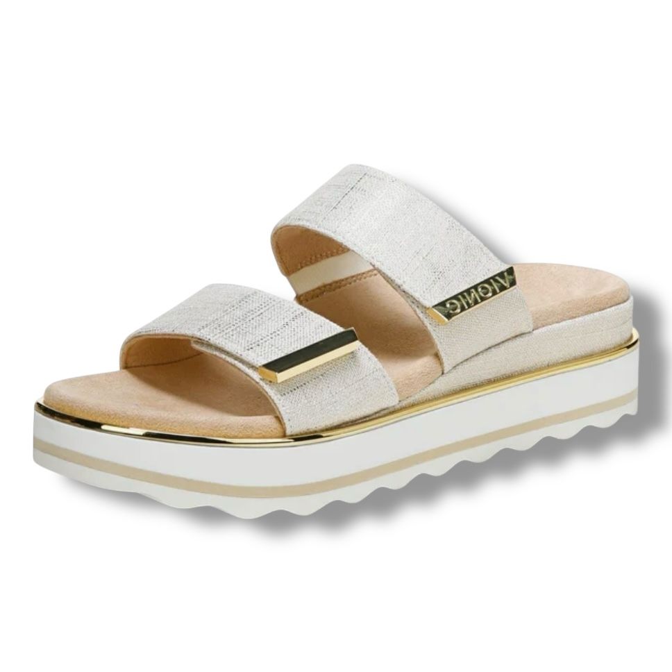 Vionic Brandie Platform Sandals Women's Sz 10 Marshmallow/Gold accents Slide The Vionic Brandie Platform Sandals in women's size 10 feature a stylis