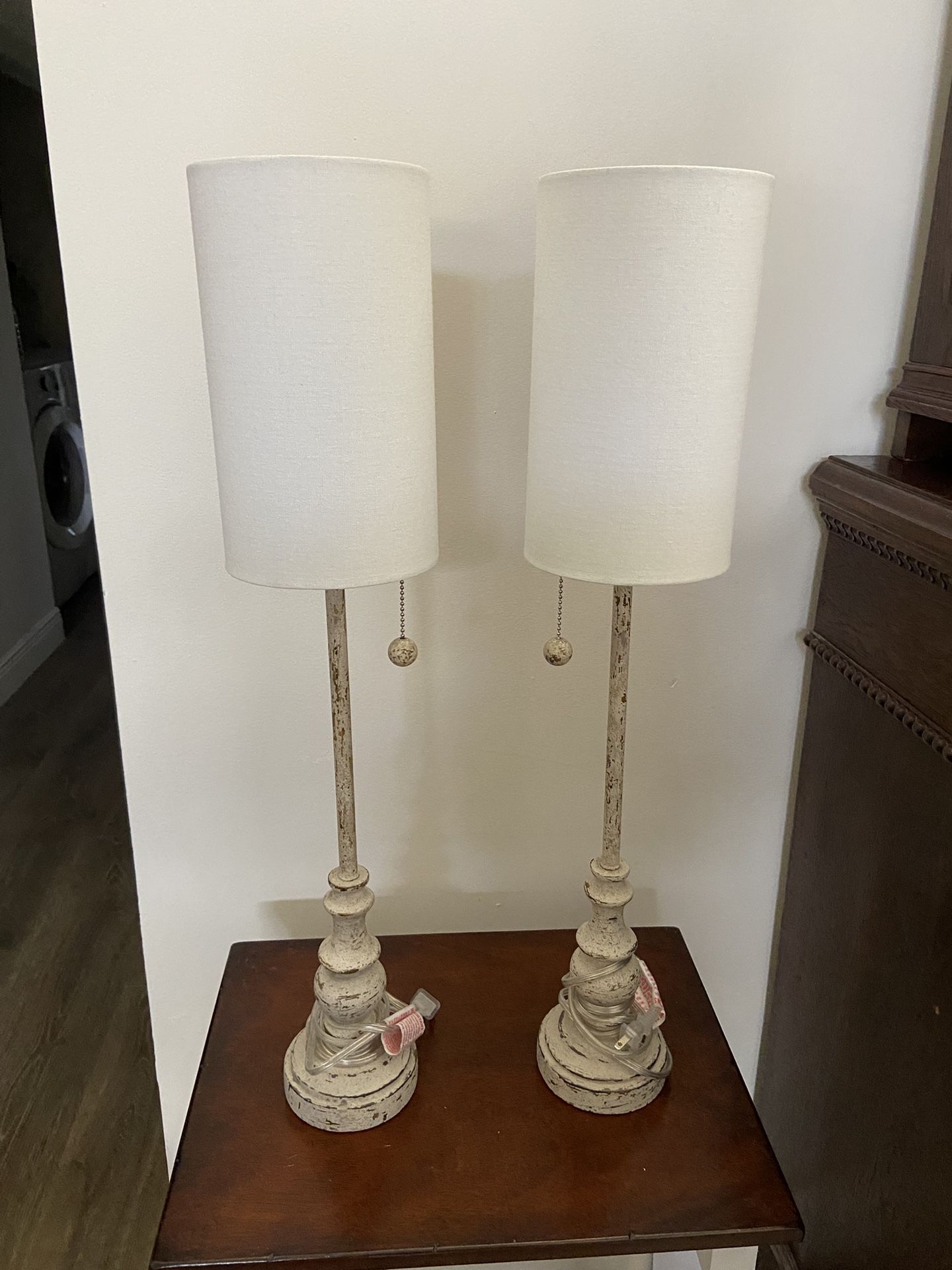 Total of 3 buffet lamps. One didn’t make the photo. Never used. Pull chain, distressed off white finish metal base. Coordinates with modern, farmhouse, or coastal decor. Can be painted. White cylindrical shades.
