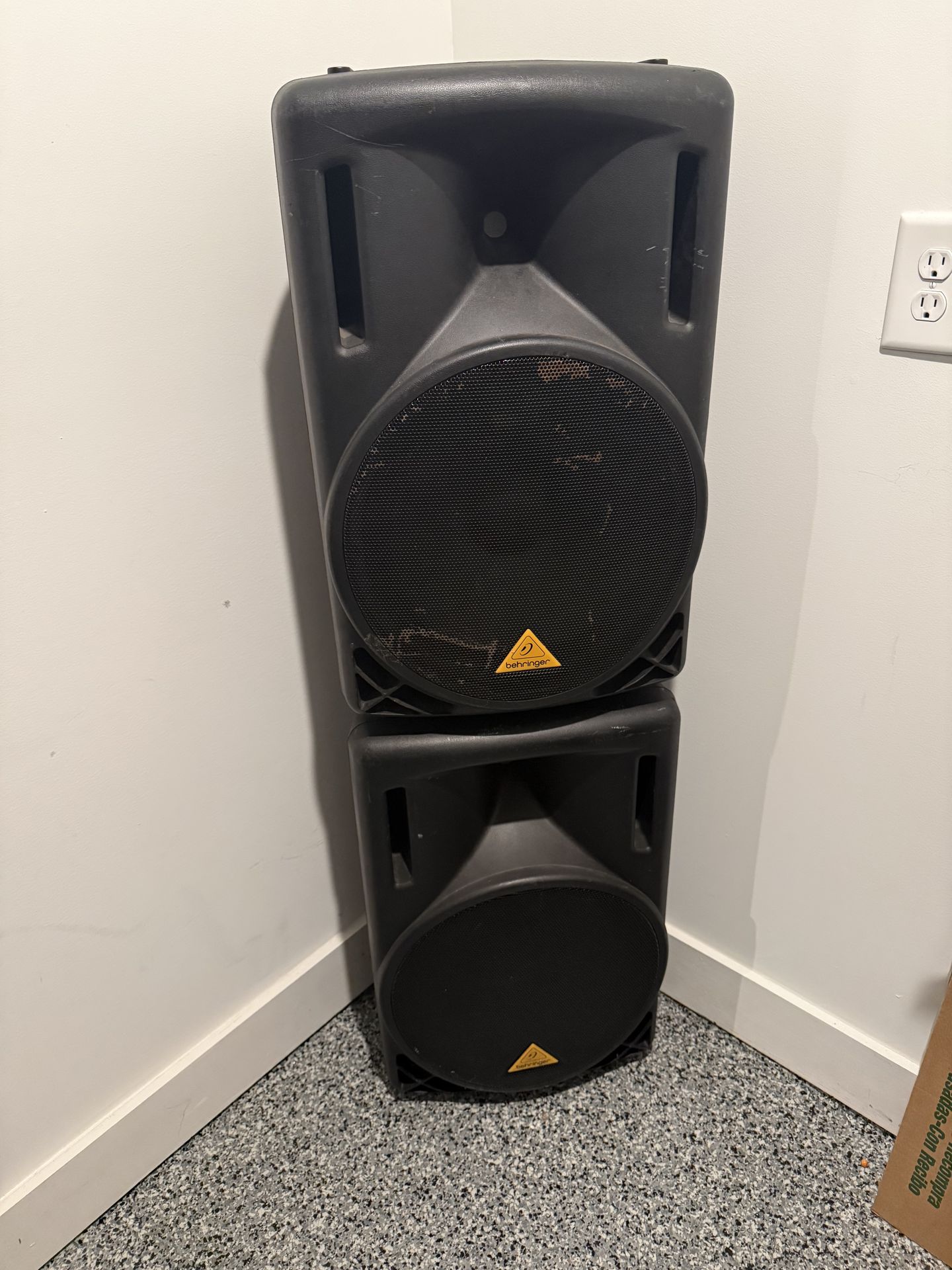 Pair of Behringer Eurolive speakers as is. $329 value for a single speaker this is a pair with chords included. NO AMP INCLUDED. Can guarantee 1 speaker is in perfect working condition. Full transparency the other speaker may be blown