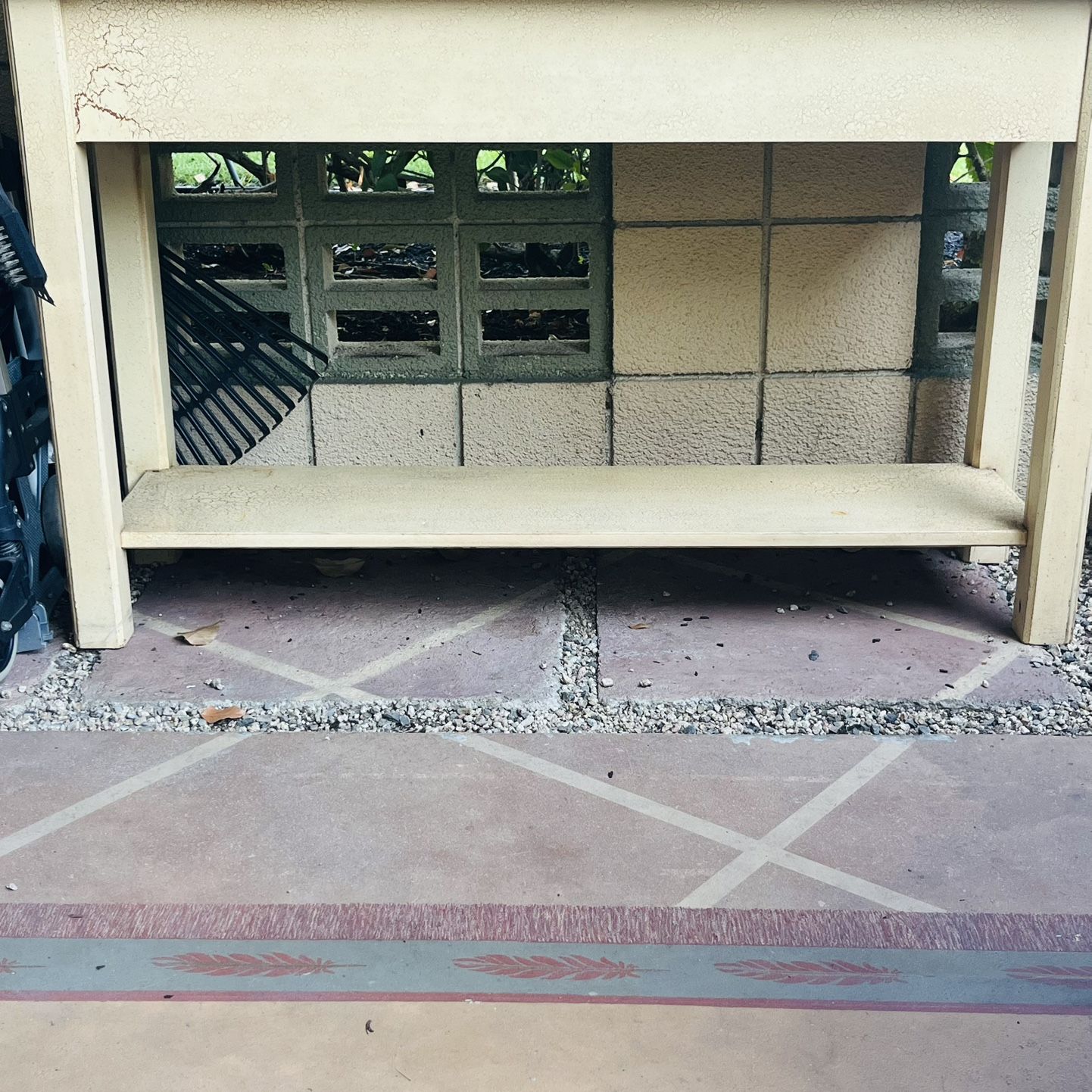 Lovely heavy side table (yellow , with design). 54” long 16” wide 29” tall , can be used as a buffet serving table or behind couch for lamps or as many other ideas such as kitchen island . Who doesn’t Need Extra Serving Space while entertaining guests during the Holidays? Great kitchen island if u put leg extension or Locking roller wheels that are 6”” EASY transformation and can then be rolled around fora variety of Uses located in laguna woods 92637 this table does not show the true beauty of it , must see to appreciate it, very unique vintage crackle paint job