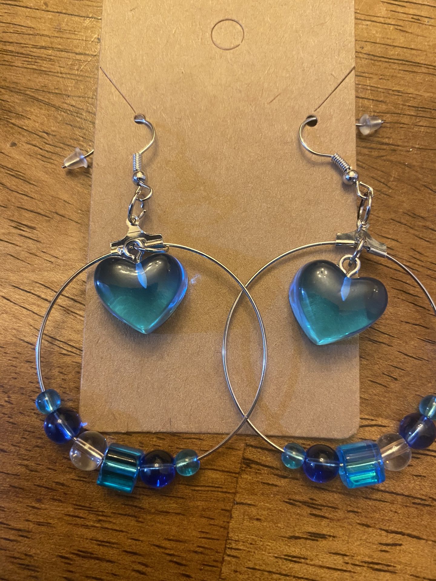 Homemade beaded earrings color blue with blue heart charm . The hoop does open when you pull on it FYI . One at this price, not going to find in any stores. All my earrings and necklace are hand crafted.