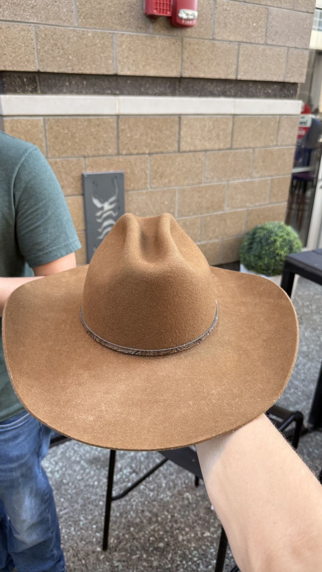 has jackson hole logo branded in back very small it’s a 7 1/4 size bought new $210 it’s in good condition, if you tell me what you want it too look like before hand i can shape it for you, (i’m a hat shaper)