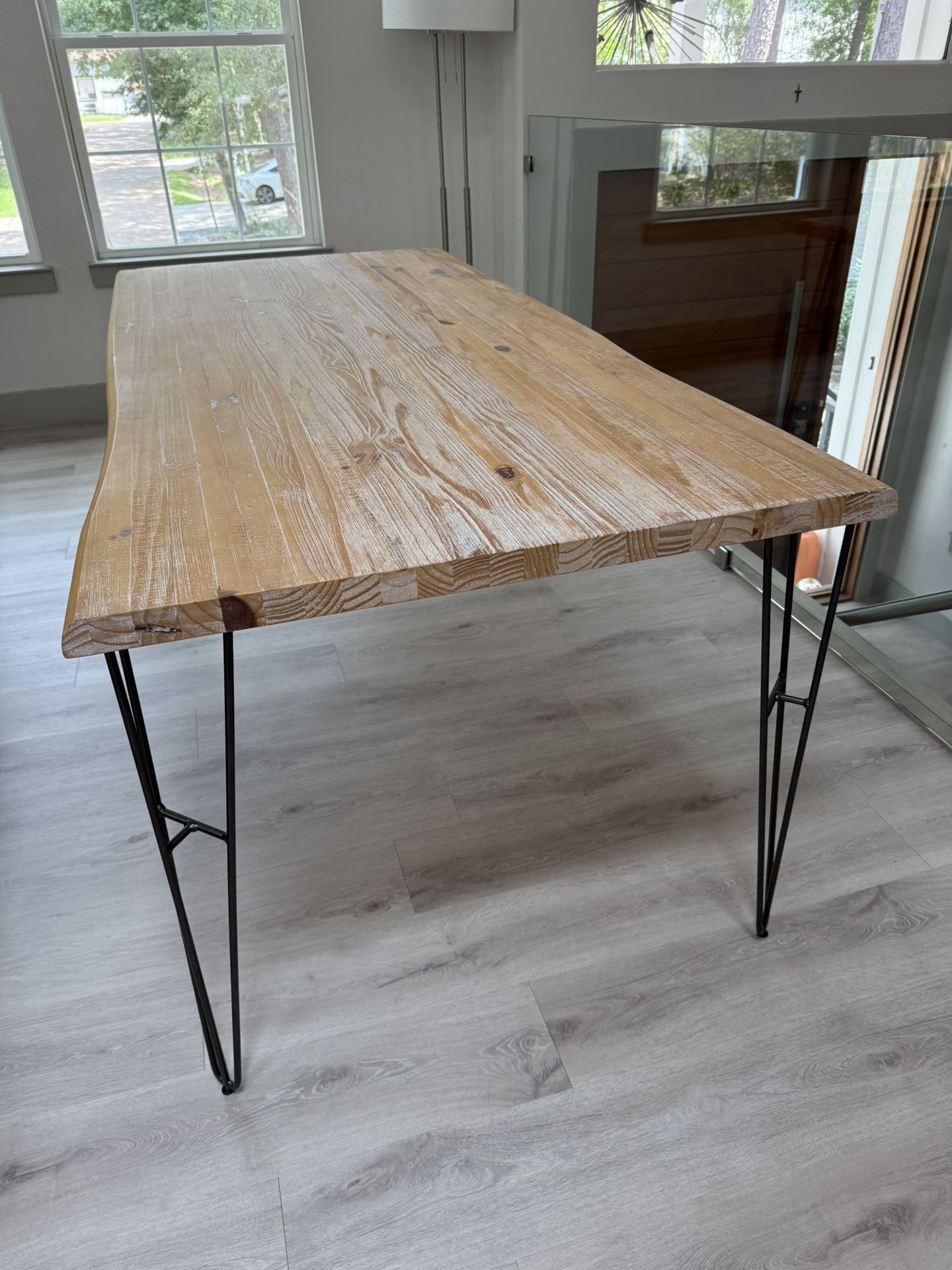 Stylish wooden table with sturdy metal legs, perfect for any room. Solid wood. Excellent condition. Was used in office for a year in a study lounge. It was never dined on in a home. Table alone is $500 at rooms to go. You get opportunity to mix and match your own style of chairs as this is just table for sale.
