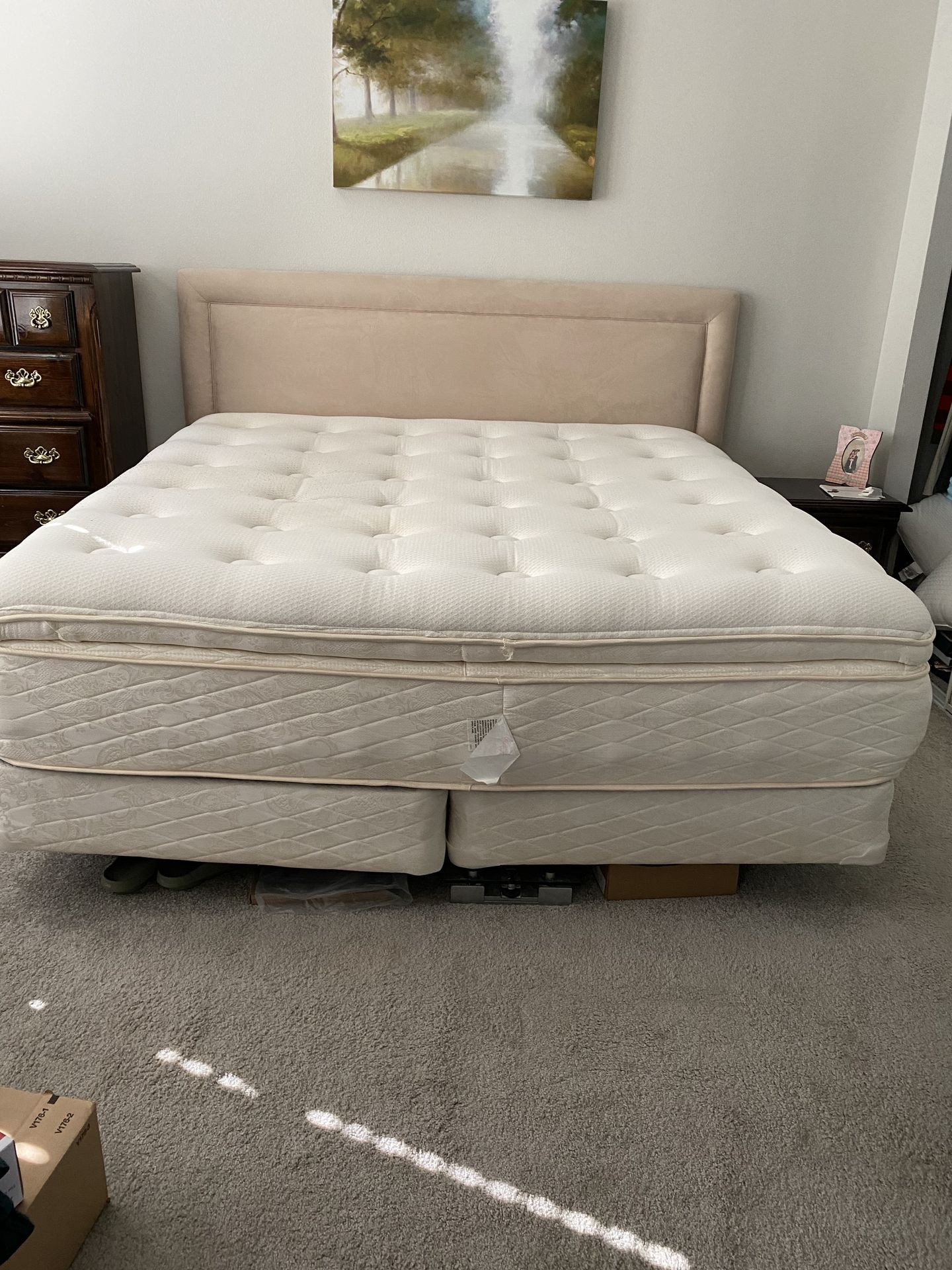 Cal King, pillow top, medium firm mattress. Includes box spring and upholstered headboard. Used, good condition. Also includes microfiber comforter and 2 sets of deep pocket bedsheets. Pickup only.