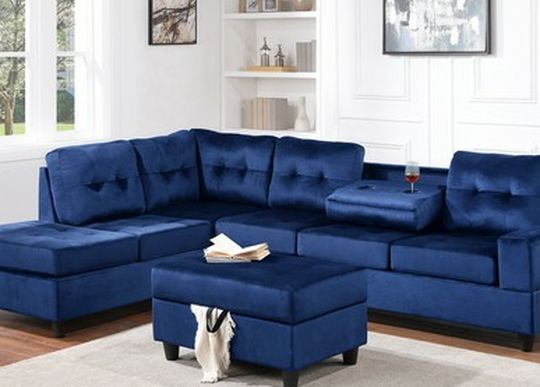 Description: Reversible Sectional and Storage Ottoman Set (Sold as Set Only) Sleek, simple, and modern. This sectional features a drop down cup holders table and a storage ottoman. Dimension: RAF SOFA: 78L x 34D x 34H LAF CHAISE: 80L x 34D x 34H Storage Ottoman: 34 x 24 x 18H