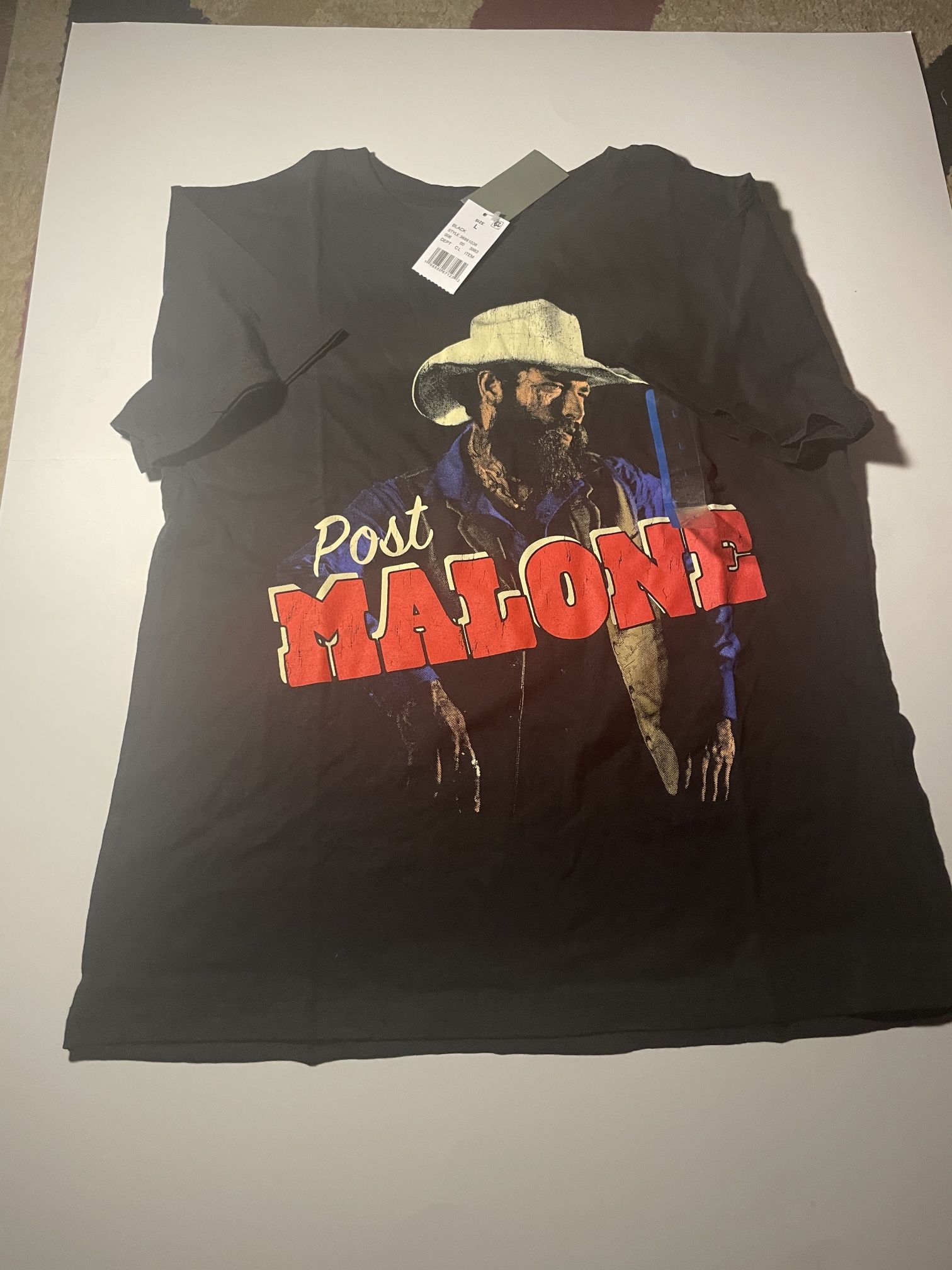 Black t-shirt featuring a bold graphic design with red and blue accents. It has Post Malone on it. Its new with tags and mens size large.