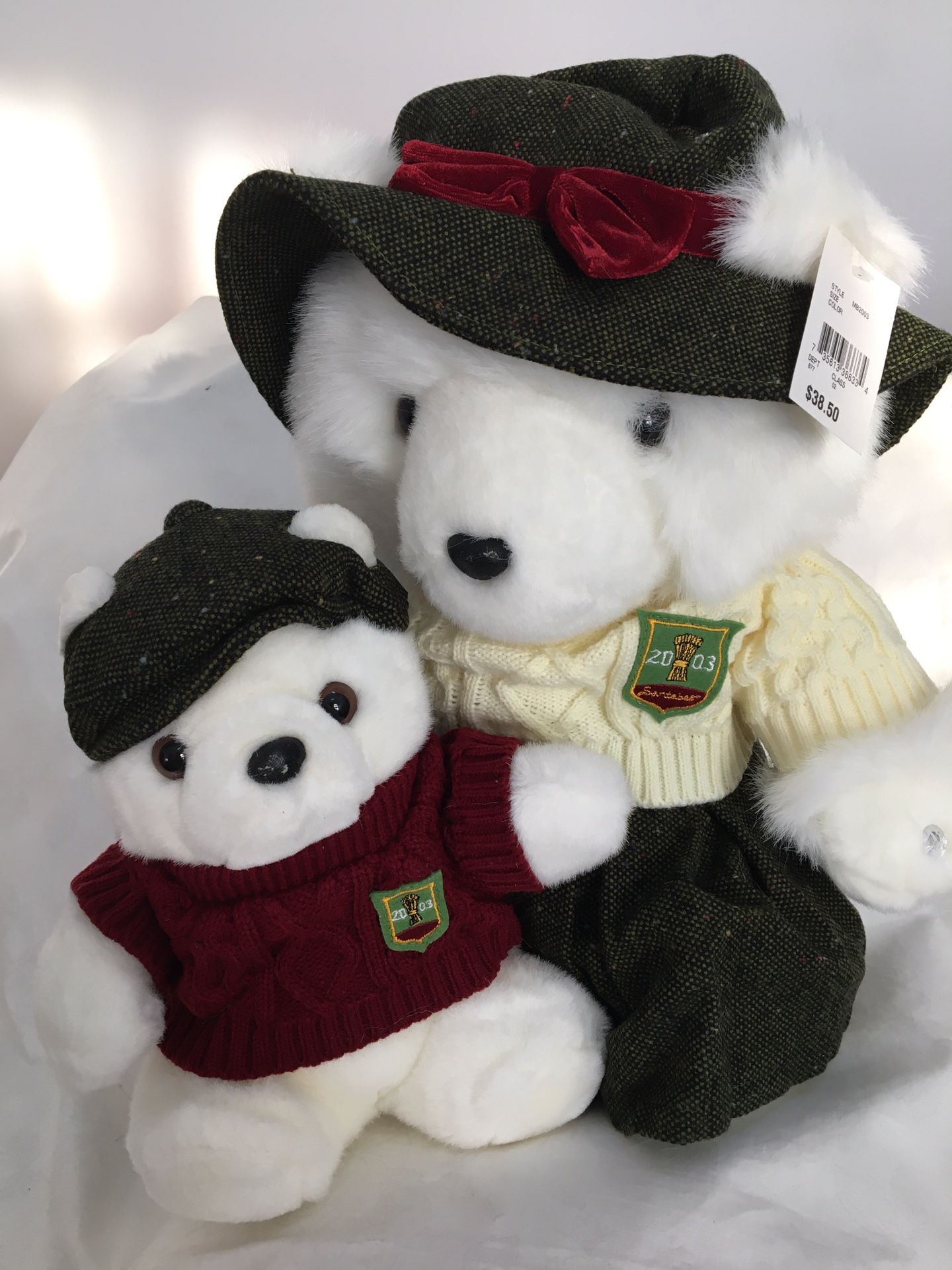 Collectible Dayton Hudson/Marshall Field’s plush Emerald Isle mother and baby bear. Includes original bag. New. Dressed Irish style in cable sweater, tweed and cap.