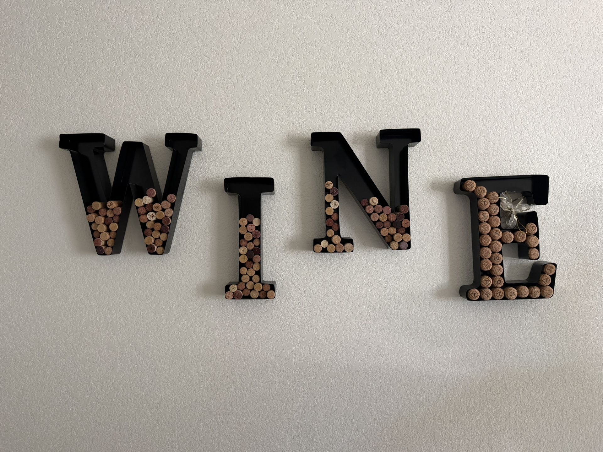 Add charm to your kitchen, bar area, or dining room with this stylish set of decorative wall letters spelling WINE. Each letter is a hollow black metal frame designed to hold and display wine corks. Details: • Set includes all four letters: W, I, N, E • Each letter is approximately 12 inches long and up to about 9 inches wide • Black metal construction • Easy to hang and makes great décor for wine lovers Perfect for gifting or enhancing your home bar aesthetic.