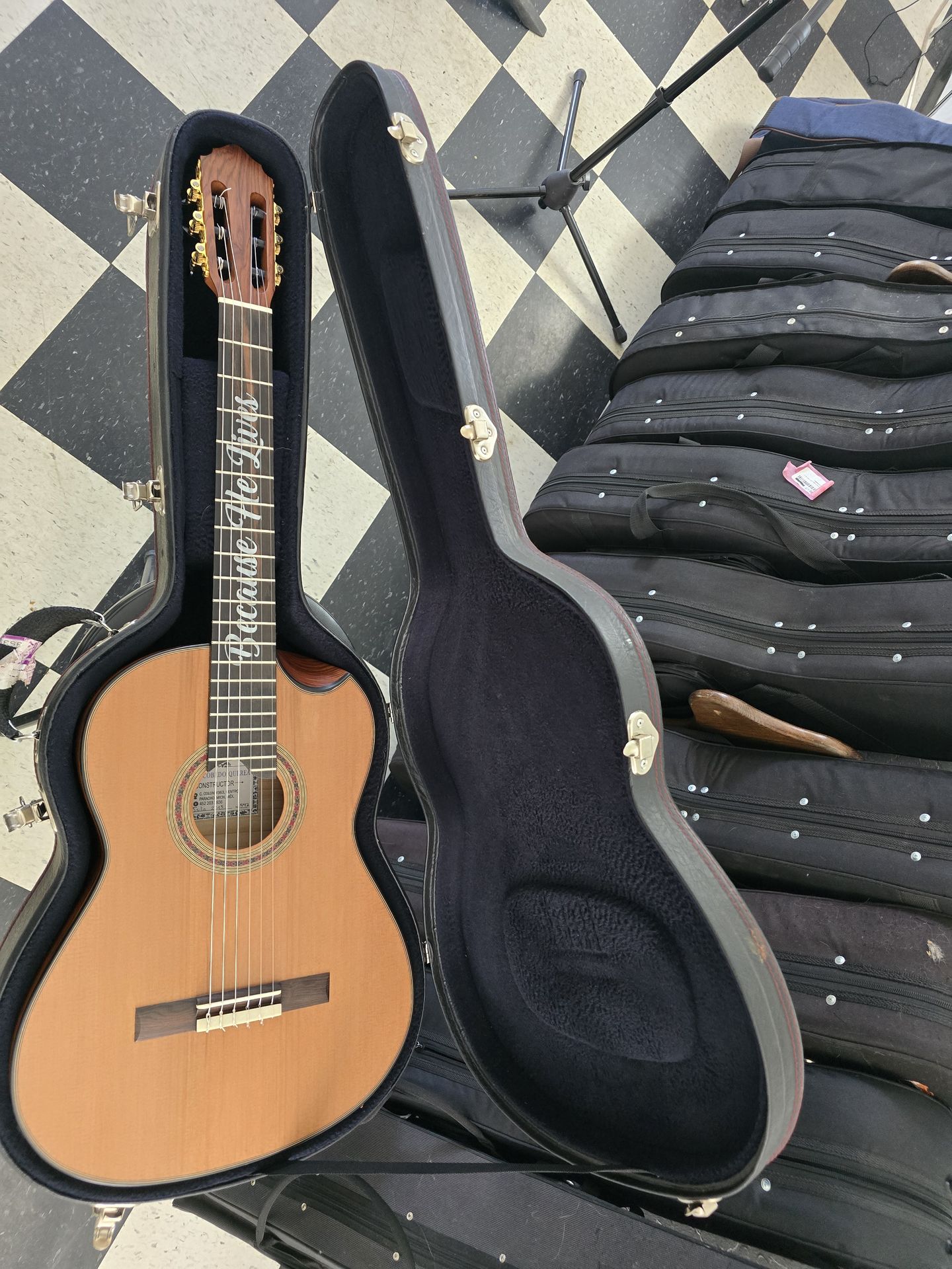 Im parting with a couple of my Nylon guitars. I have a few. This one specifically is a Classic christian hymn themed "Because He Lives" guitar. The sound is empecable, and playability is phenomenal with the ebony fretboard. Body is paloescrito. I bring the from parach michoacan, a renowned village in the hills of Mexico.